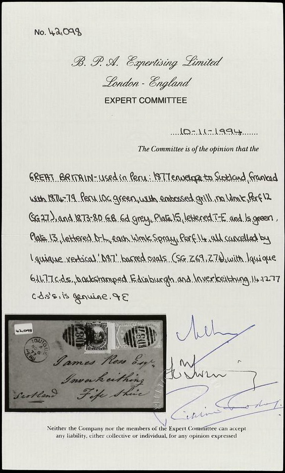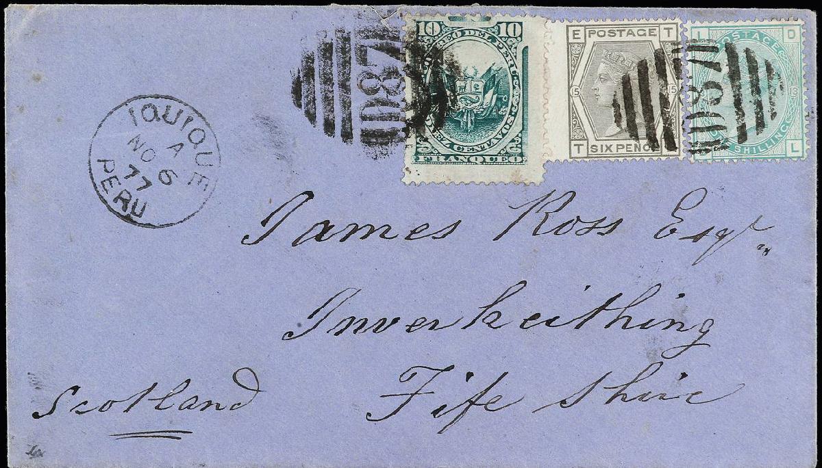 | Zusatzinformationen und Suchstichworte: | Soler y Llach - 788. Auktion 4. - 5. Juli 2023 Los 2558 Peru PERU. 1877 (Nov 6). Kombination Brief aus IQUIQUE zu INVERKEITHLING (Schottland) freigemacht für interne Gebühr mit Peru 1874/76 10 c. grün (Scott 25) und großartig Briatin 1874 6 d. grau Pl. 15 und 1 s. Grün Pl. 13 alle entwertet mit zwei kräftigen Abschlägen von er D87 oliterator mit feinem IQUIQUE/gezahlt Datumsstempel daneben gesetzt (Nov 6). Rückseitig mit Edinburg Transit und INVERKEITHLING Ankunft Datumsstempeln (Dec 14). Nur ein paar Kombination Umschlägen bekannt ab IQUIQUE. Eine seltene und extrem attraktiv Brief. Attest BPA (1994). Ex col. P. Kornan, A. Landini und H. Wood Ausruf 2.000,00 EUR |