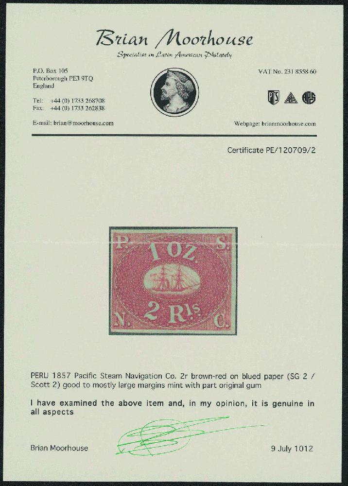 | Zusatzinformationen und Suchstichworte: | Gert Müller 119. Auktion 24. - 26. August 2023 Los 3109 Peru 2 Reales karmin auf bläulich, Pacific Steam Navigation Company 1857, wundervoll farbfrisch, allseits voll- bis breitrandig mit Originalgummierung. Ein Luxusstück dieser klassischen Südamerika-Rarität! Fotoattest Brian Moorhouse Ausruf 1.500,00 EUR |
