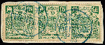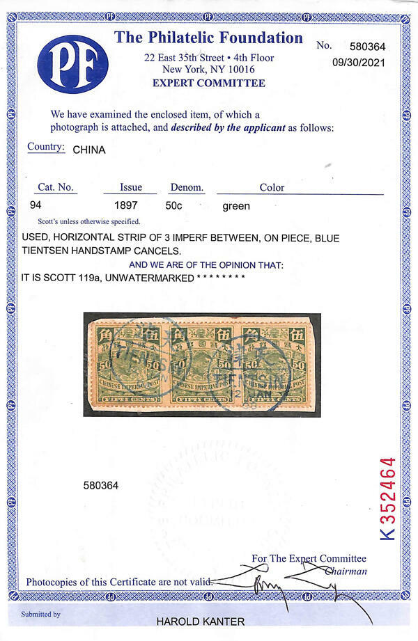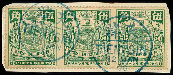 | Zusatzinformationen und Suchstichworte: | Kelleher & Rogers - 39. Auktion 11. - 12. Juli 2023 Los 1293 China Imperial Post 1900, Chinese Imperial Post, unwatermarked, 50¢ yellow green, imperf between (Chan 125d var. Scott 119a var.), horizontal strip of 3, perforated all around, imperforate internally, clean and well-centered, tied by two blue Tientsin bilingual 12 JAN 08 cancels, Very Fine, a great rarity—not listed as a strip of three in Scott or Chan—in exceptional condition, with 2021 P.F. certificate as Scott #119a. Zuschlag 8.500,00 HKD |