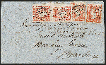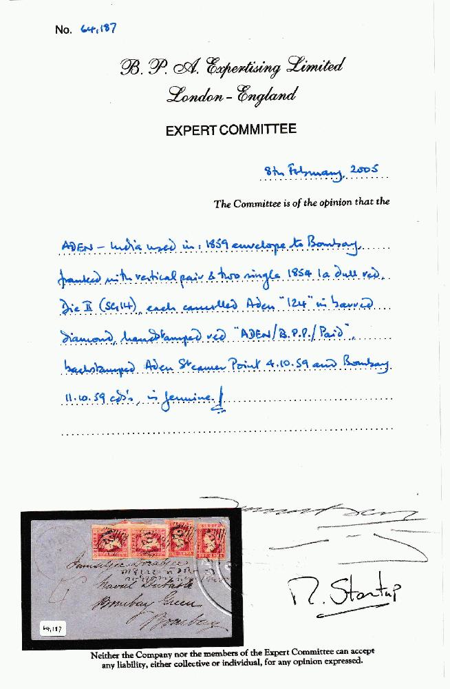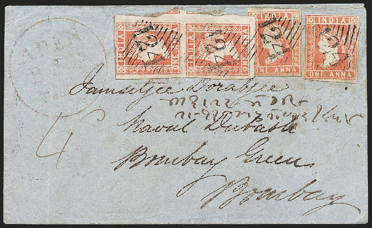 | Zusatzinformationen und Suchstichworte: | Robert A. Siegel - The Magnolia Collection: India Postal History & Stamps Used Abroad 11. Mai 2023 Los 204 Aden Gebraucht in Aden, 1854,1a mattrot, Platte II (4B; SG 14). Senkrechtes Paar und zwei Einzelmarken, meist breite bis noch sichtbare Ränder, mit Mühe und Not berührt außen Randlinie auf einer einzeln, Paar mit kleinem Anteil von angrenzenden Briefmarken rechts, entwertet mit "124" Diamant Gitterstempel auf blauer Briefhülle nach Bombay, rot "Aden B. P.P. Gezahlt" Ellipsenstempel, zart abgeschlagen Aden Dampfer Punkt Oct. 4,1859 Abfertigung Datumsstempel auf Rückseite, handschriftlich "4" Taxierung, Bombay Ankunftsstempel, Briefmarken mit Spur von Verschmutzung Pracht. Spätverwendet einer Paar und zwei Einzelmarken des 1854 ONE-ANNA auf PACKET Brief aus ADEN nach Indien. Ex Dr. Kornan. Mit 2005 B. P. A. Attest Ausruf 1.500,00 USD |