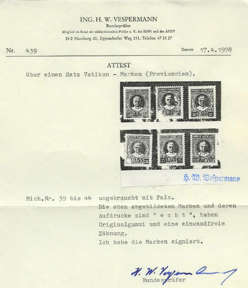 | Zusatzinformationen und Suchstichworte: | Bielefelder 98. Auktion 9. September 2023 Los 834 Vatikanstaat Freimarken 1934 mit Aufdruck, ungebr. Prachtsatz mit Falz, signiert und Fotoattest 1978 Vespermann BPP. Mi. 1.000,-€ Ausruf 250,00 EUR |