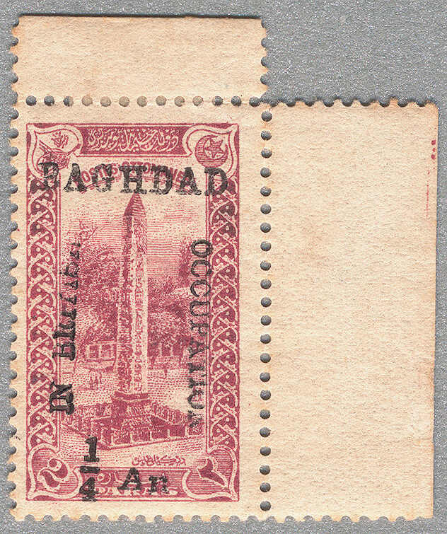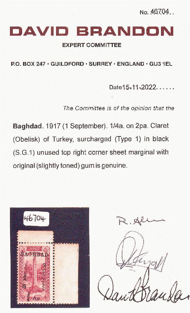 | Zusatzinformationen und Suchstichworte: | 19. classicphil GmbH Auktion 12. - 13. September 2023 Los 1539 Irak Britische Besetzung von Bagdad 1917,1/4a auf 2pa, weinrot (Obelisken), überdruckt in schwarz (Type 1), ungebraucht obere rechte Ecke, mit ober und richtigem gerandet, großer Teil Originalgummi, sehr frisch und gesucht, Prüfungsbefund Brandon, Kabinett! Schätzpreis 700 EUR Ausruf 220,00 EUR |