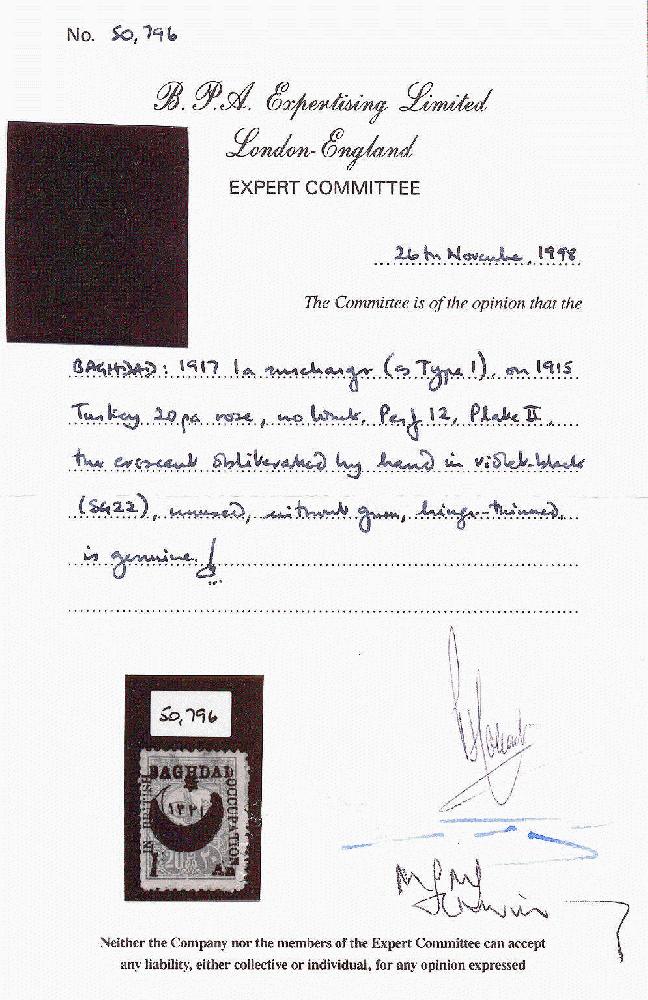| Zusatzinformationen und Suchstichworte: | 19. classicphil GmbH Auktion 12. - 13. September 2023 Los 1549 Irak Britische Besetzung von Bagdad 18,1a auf 20pi, rosa, überdruckt in schwarz (Type 1), Überdruck in schwarz mit sechszackiger Stern und arabischen Datum 1331 über hand-obliterated Halbmond in schwarzviolett, ungebraucht, ohne Gummi, sehr frisch und gesucht, Prüfungsbefund BPA, Kabinett! Schätzpreis 2,000 EUR Ausruf 650,00 EUR |