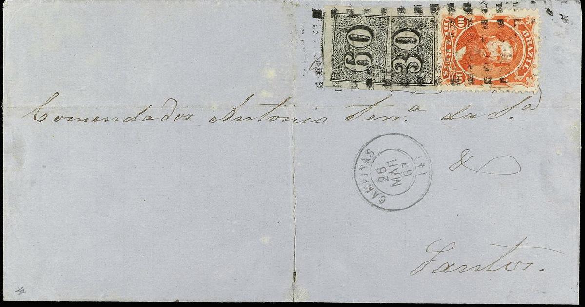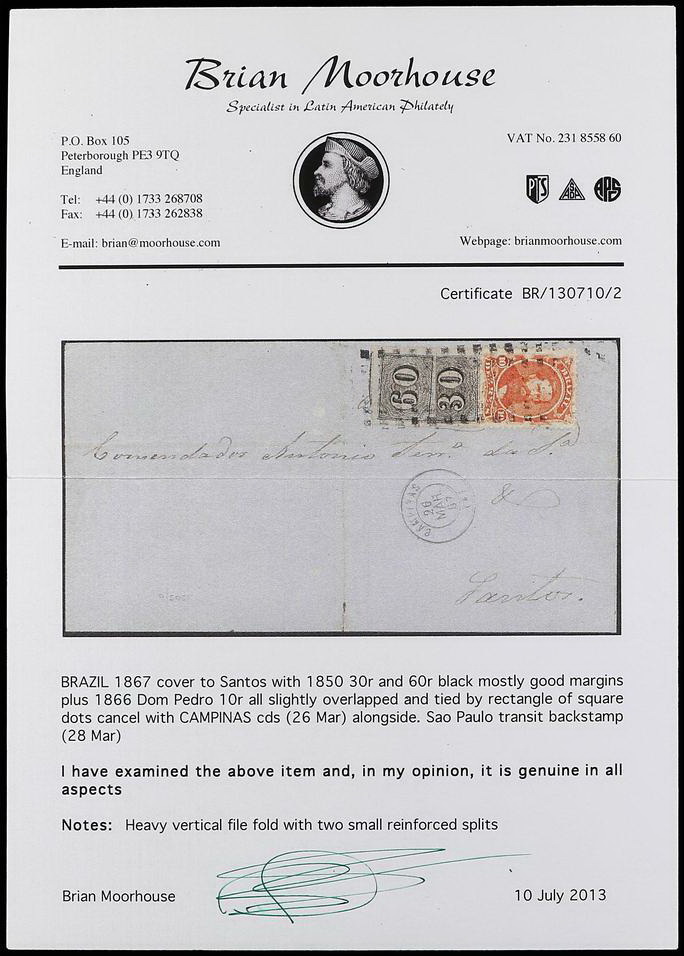 | Zusatzinformationen und Suchstichworte: | Soler y Llach - 788. Auktion 4. - 5. Juli 2023 Los 2050 Brasilien BRASIL. 1867. CAMPINAS a SANTOS. 30 reis negro, 60 reis negro y 10 reis naranja. Mat. rectángulo de puntos. MUY RARA combinación de franqueo para hacer los 100 reis del porte. Ex Alemany. Cert. B. MOORHOUSE. Sc.23, 24, 53 Zuschlag 250,00 EUR |