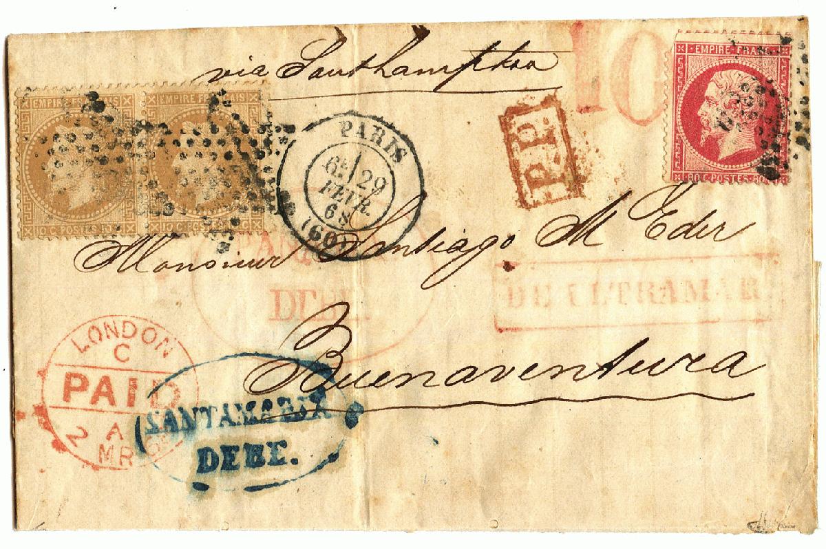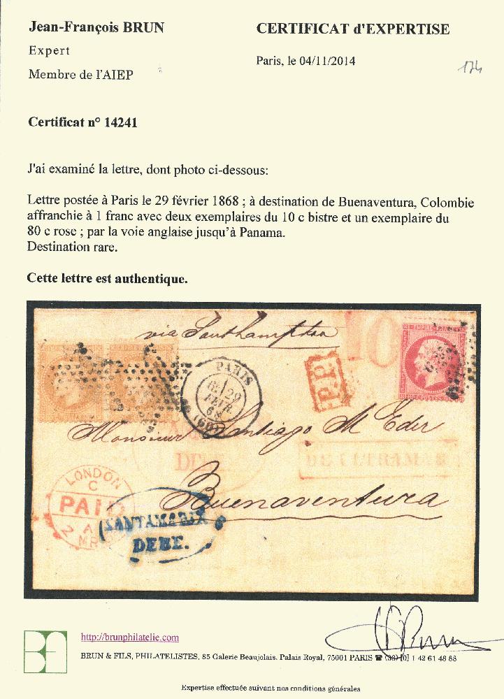 | Zusatzinformationen und Suchstichworte: | Lugdunum 125. Auktion 18. September 2023 Los 960 Kolumbien COLOMBIA : 1868 Pair 10c (n°28) + 80c (n°24) + Boxed DE ULTRAMAR + SANTAMARTA / DEBE blue + PANAMA / DEBE red on entire from PARIS to BUENAVENTURA (COLOMBIE). Scarce. J.F BRUN Certificate (2014). Vf Ausruf 600,00 EUR |