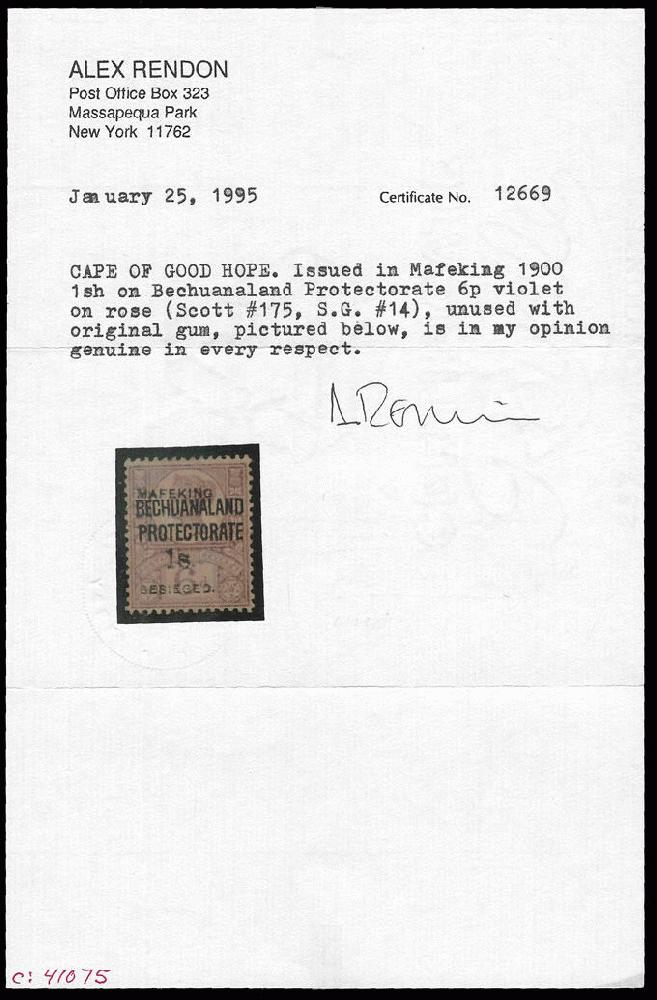| Zusatzinformationen und Suchstichworte: | Filat AG Shop Neu Los 6222 (D) Kap der Guten Hoffnung 1900 1/- on 6d purple on rose-red of Bechuanaland Protectorate, Type 2 Overprint (SG 14). VF/M large part OG example. Well-centered, fresh. A rarity as few copies remained unused. Photo-certs: Rendon & Eichele BPB: "A fresh, well centred and very rare stamp unused with very few known." (cv£7500). See additional image and of certificates below Festpreis 9.250,00 CHF |