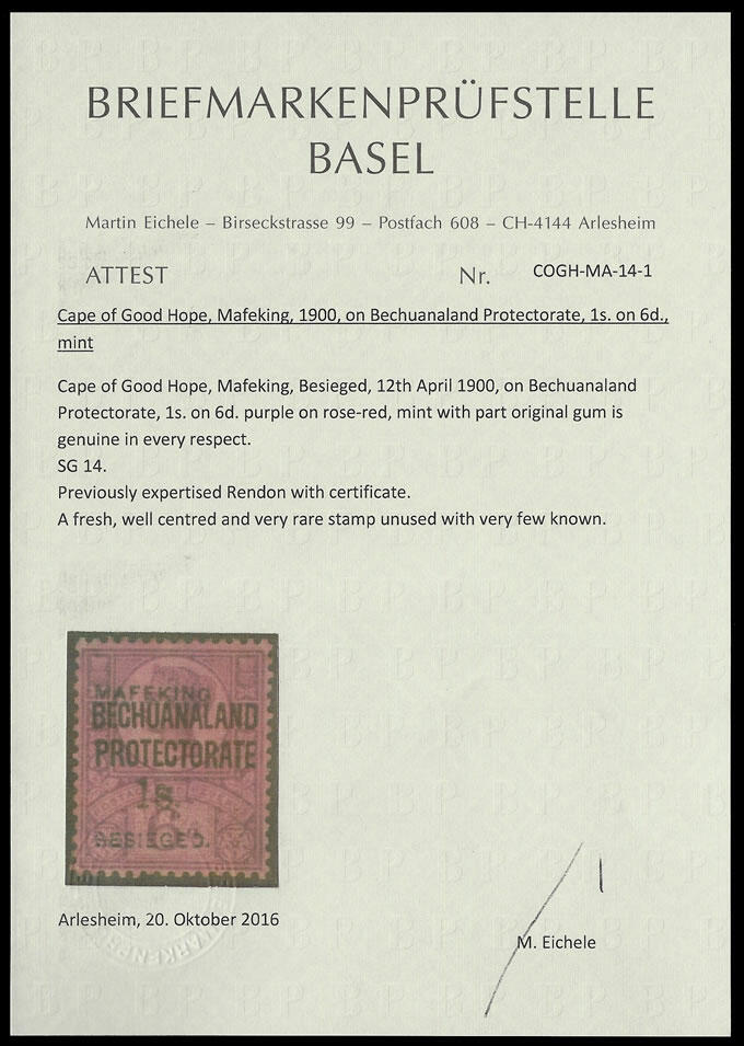 | Zusatzinformationen und Suchstichworte: | Filat AG Shop Neu Los 6222 (D) Kap der Guten Hoffnung 1900 1/- on 6d purple on rose-red of Bechuanaland Protectorate, Type 2 Overprint (SG 14). VF/M large part OG example. Well-centered, fresh. A rarity as few copies remained unused. Photo-certs: Rendon & Eichele BPB: "A fresh, well centred and very rare stamp unused with very few known." (cv£7500). See additional image and of certificates below Festpreis 9.250,00 CHF |