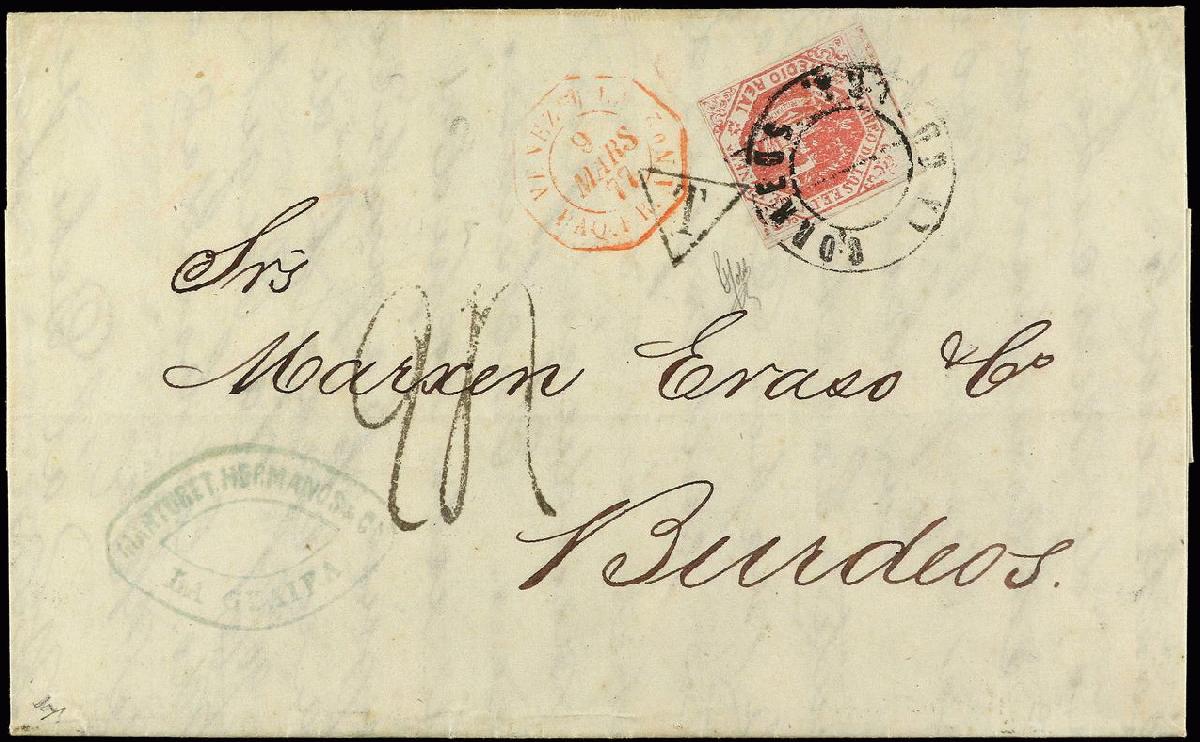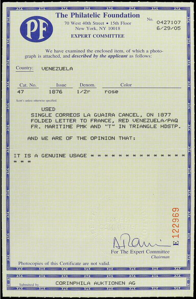 | Zusatzinformationen und Suchstichworte: | Soler y Llach - 788. Auktion 4. - 5. Juli 2023 Los 2788 Venezuela VENEZUELA. 1877. LA GUAIRA a FRANCIA. 1/2 real rosa. Circulada por correo francés. Fechador marítimo VENEZUELA / PAQ. FR. A Nº2, tasada con 24 décimas. Al dorso llegada. Cert. HOLCOMBE y P.F.´2005. Sc.47 Ausruf 500,00 EUR |
