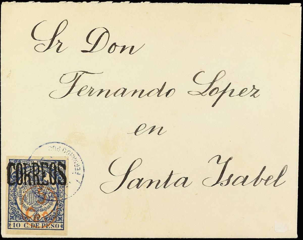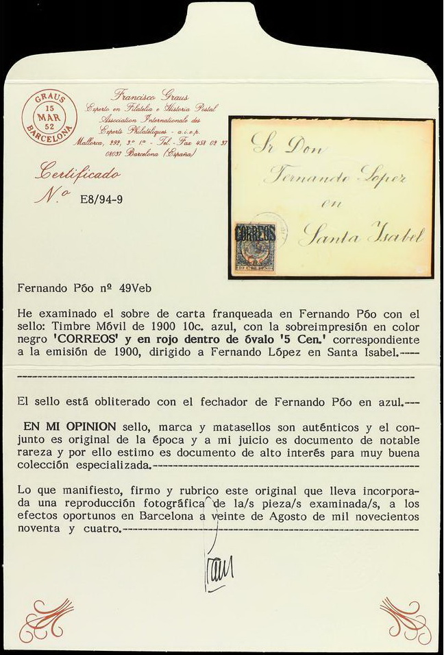 | Zusatzinformationen und Suchstichworte: | Soler y Llach - 790. Auktion - Spanien, Kolonien und der Rest der Welt 11. - 12. Juli 2023 Los 1197 Fernando Poo COLONIAS ESPAÑOLAS: FERNANDO POO. 1900. SANTA ISABEL. Póliza de 10 cts. azul. de 1900 habilitada para Correos 5 cts. Mat. CORREOS / FERNANDO POO. MUY RARO sello en carta y más en circulación local. Cert. GRAUS. Ed.48Aba Zuschlag 400,00 EUR |
