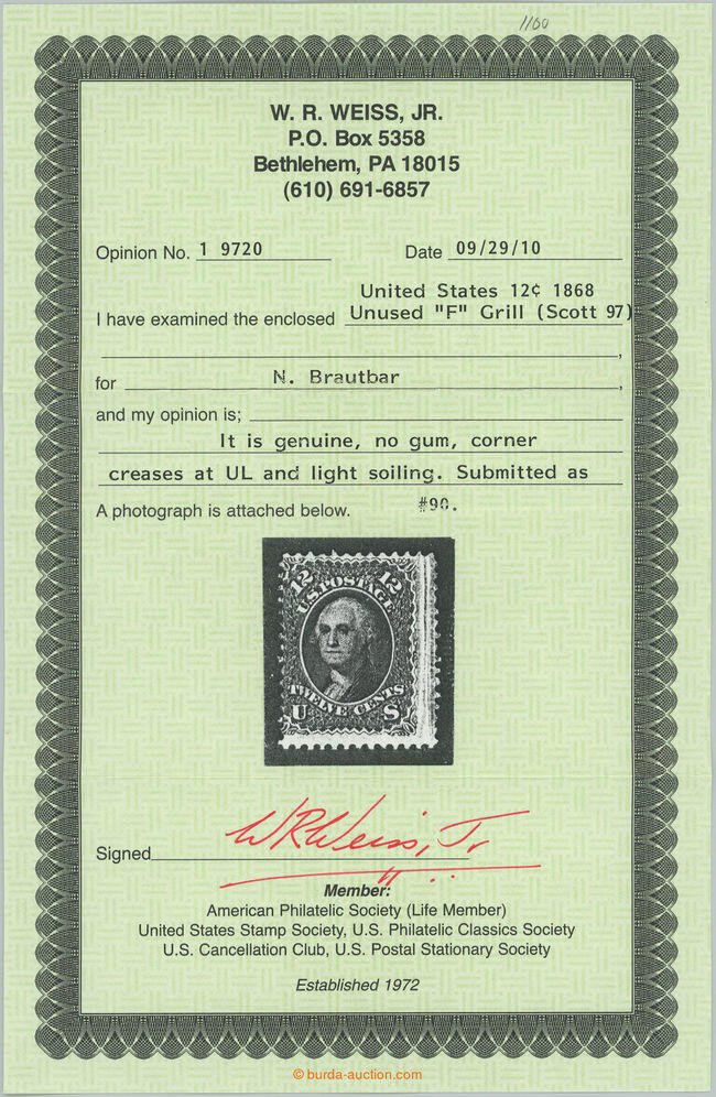 | Zusatzinformationen und Suchstichworte: | Burda 72. Auktion 16. - 17. September 2023 Los 539 USA 1861-1866 Sc. 97, Washington 12c schwarz, Gitter 9x 13mm; ohne Gummi mit leichter Knick, insgesamt fein, Attest W. R. Weiss APS, c. v. Für (*) $1 Ausruf 298,00 EUR |