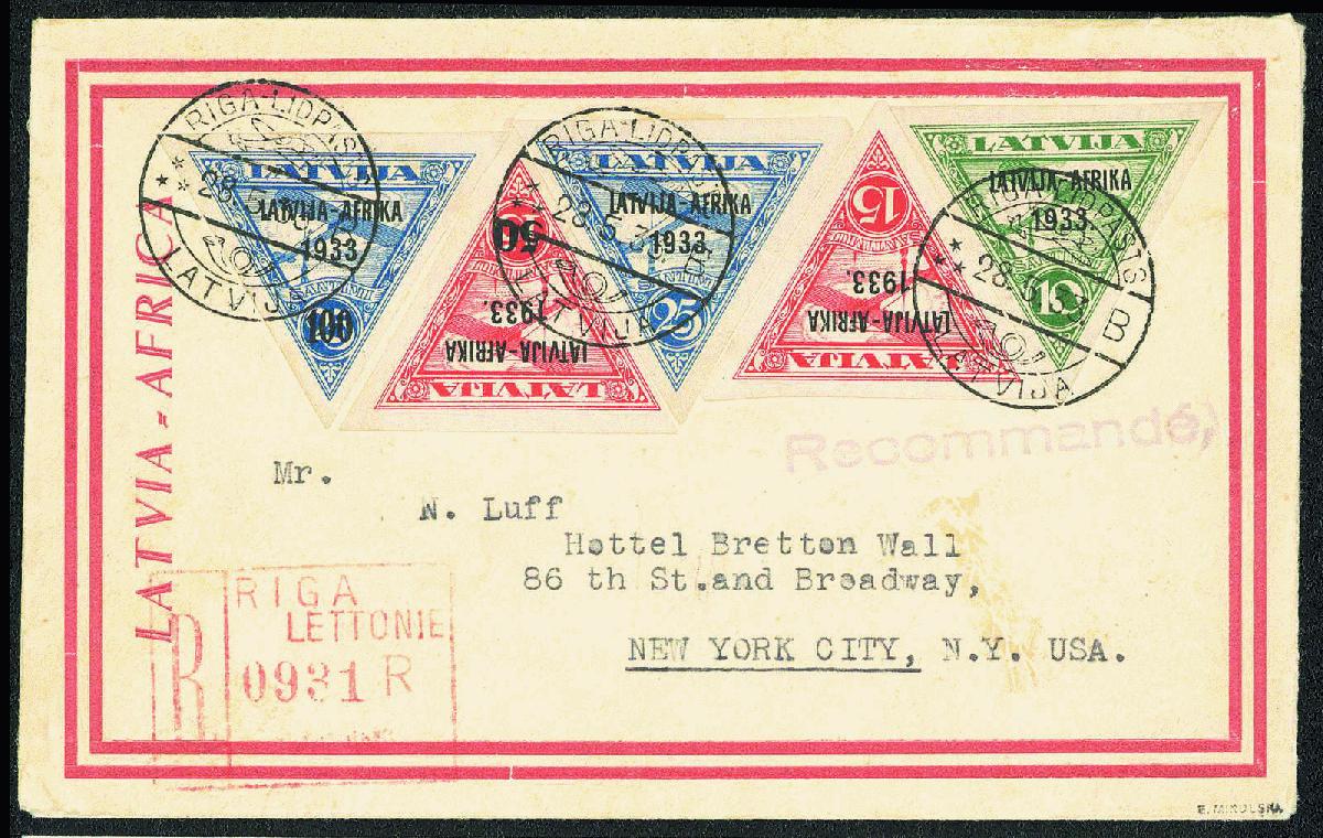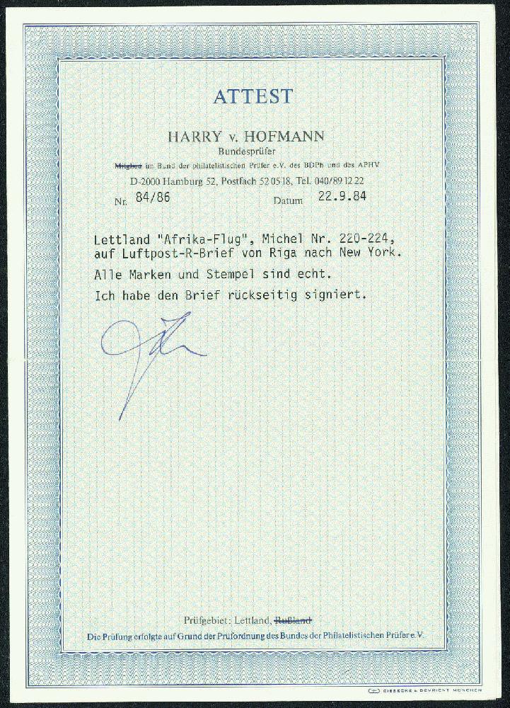 | Zusatzinformationen und Suchstichworte: | Gert Müller 119. Auktion 24. - 26. August 2023 Los 3310 Lettland Afrika-Flug 1933, die komplette Serie zu fünf Werten, farbfrisch, allseits breitrandig ungezähnt auf wunderschönem Einschreibe-Luftpostbrief mit Flugpoststempel "RIGA-LIDPASTS 28.5.33." nach New York/USA mit Ankunftsstempeln. Derart schöne Flugpostbriefe mit der kompletten Serie sind außerordentlich selten! Fotoattest von Hofmann BPP Ausruf 2.000,00 EUR |