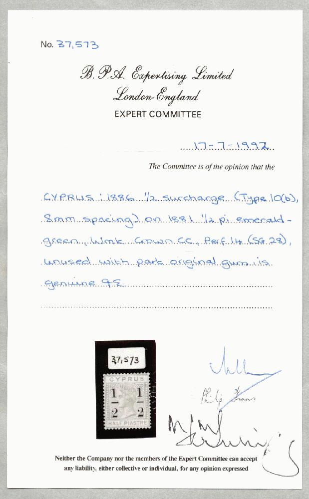 | Zusatzinformationen und Suchstichworte: | 19. classicphil GmbH Auktion 12. - 13. September 2023 Los 1367 Zypern 1886, Mai, 1/2 p auf 1/2 Pies, smaragdgrün, Wasserzeichen CC, type 10 s, urcharge mit Bruchteile 8mm getrennt, Pracht großer Teil Originalgummi, eine herrliche instance von dieser sehr seltene Marke, ex Dale-Lichtenstein, Prüfungsbefund BPA/1992, XF-SUP! Schätzpreis 10,000 EUR Ausruf 4.200,00 EUR |