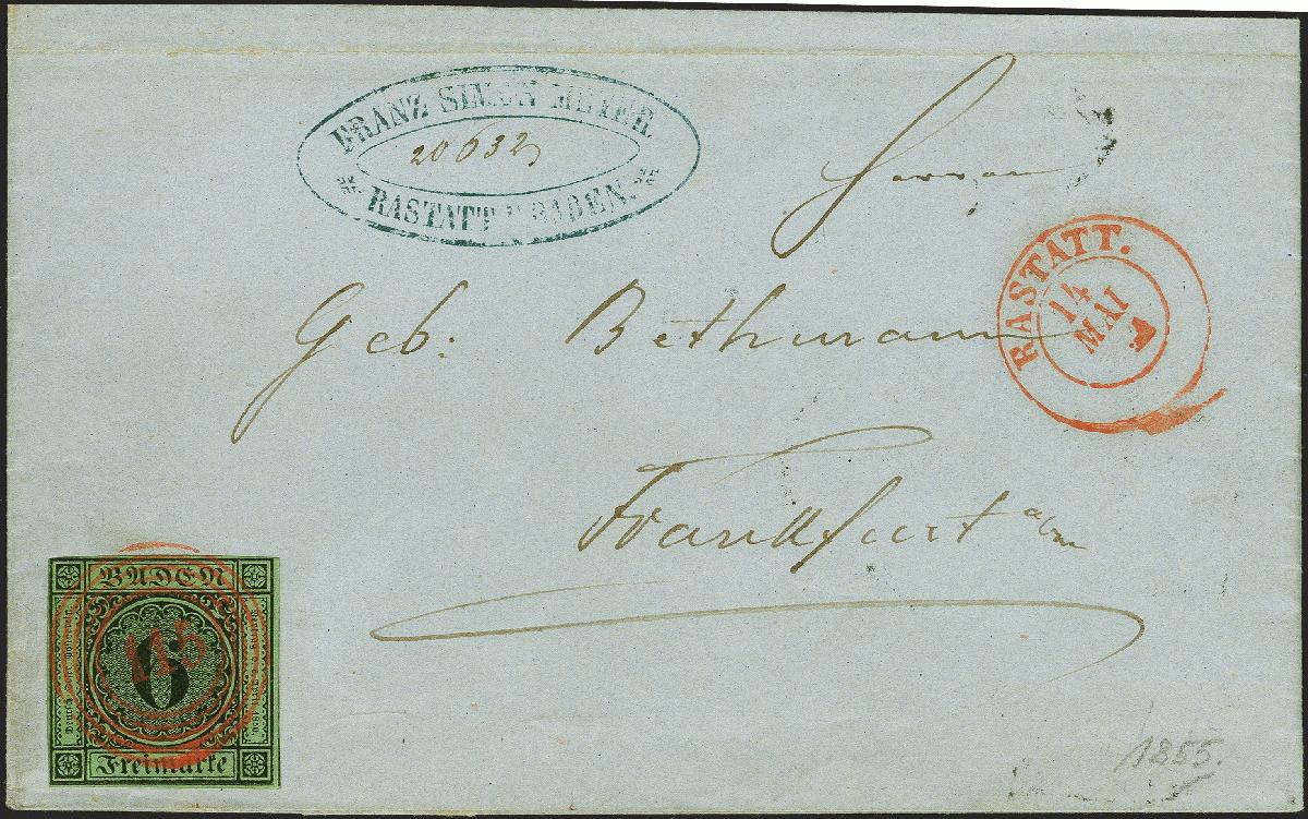| Zusatzinformationen und Suchstichworte: | 382. Auktion Heinrich Köhler 18. – 23. September 2023 Los 2 1852, 2. Auflage 6 Kreuzer schwarz auf gelbgrün, links oben minimal berührt, sonst voll- bis breitrandig, mit klar aufgesetzter roter Nr. "115" und nebengesetztem Doppelkreisstempel "RASTATT 14. MAI" (1855) auf Briefhülle der 2.Gewichtsstufe an die Gebrüder Bethmann in Frankfurt. Fotobefund Stegmüller BPP (2020) Ausruf 150,00 EUR |