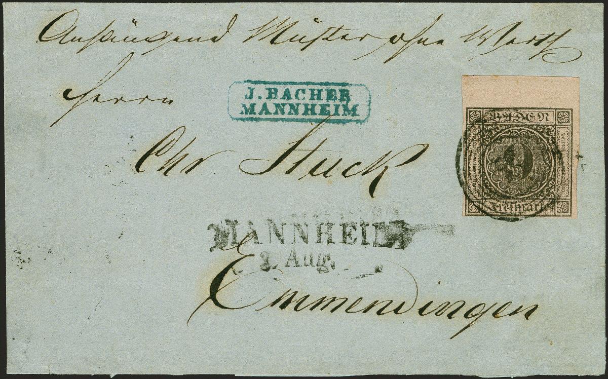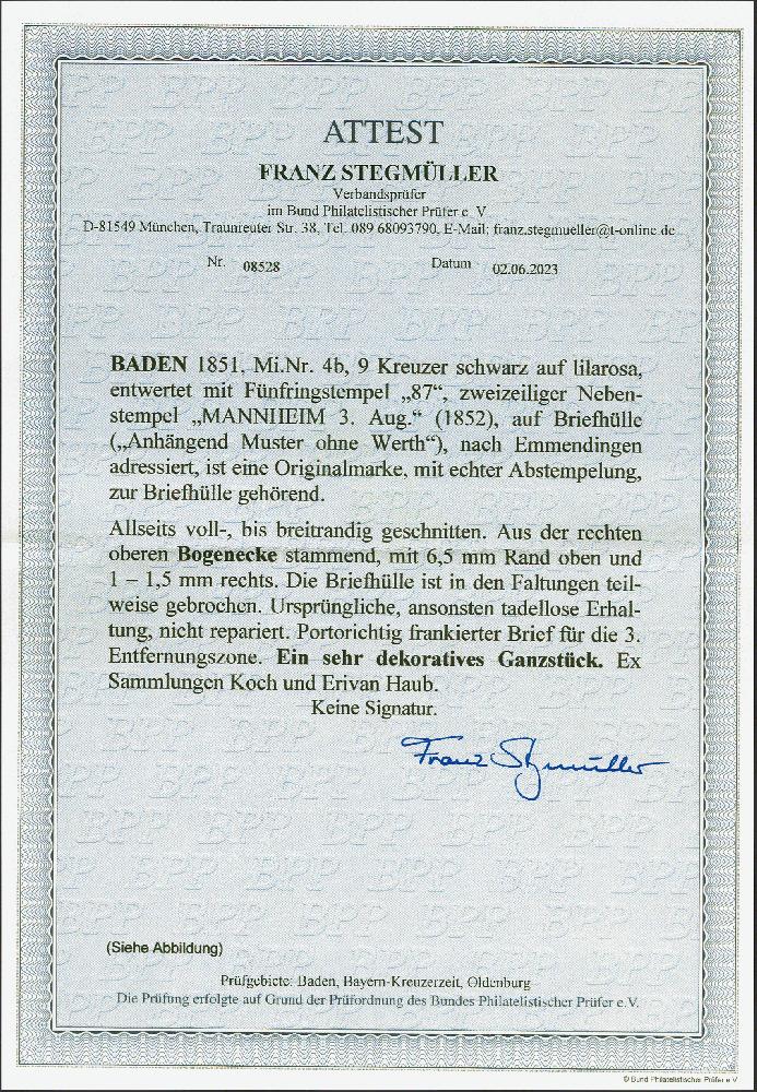 | Zusatzinformationen und Suchstichworte: | 382. Auktion Heinrich Köhler 18. – 23. September 2023 Los 5 9 Kreuzer schwarz auf lilarosa, allseits voll- bis breitrandig, aus der rechten oberen Bogenecke stammend, rechts mit schmalem, oben mit ca. 6 mm Bogenrand, mit Nr. "87" und nebengesetztem Langstempel "MANNHEIM 2. Aug." (1852) auf Briefhülle mit Vermerk "Anhängend Muster ohne Werth" nach Emmendingen. Die Hülle in den Faltungen teilweise gebrochen, sonst tadellose und ursprüngliche Erhaltung. Ein attraktiver Brief. Fotoattest Stegmüller BPP (2023) Ausruf 200,00 EUR |