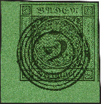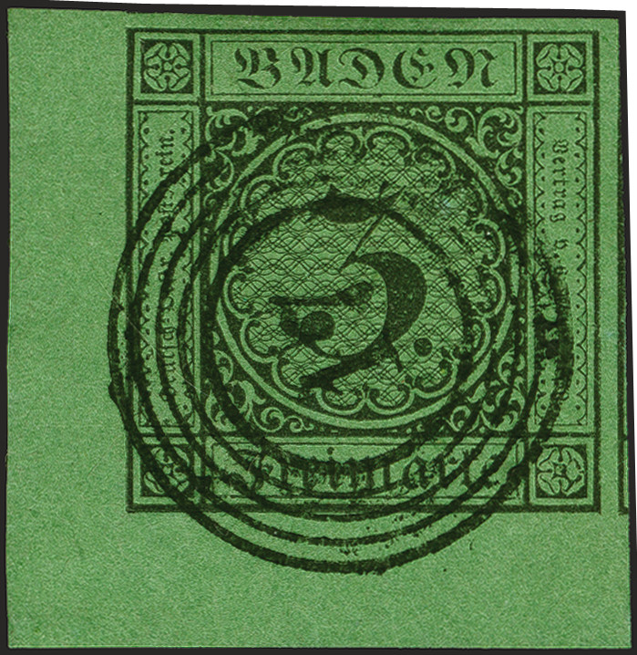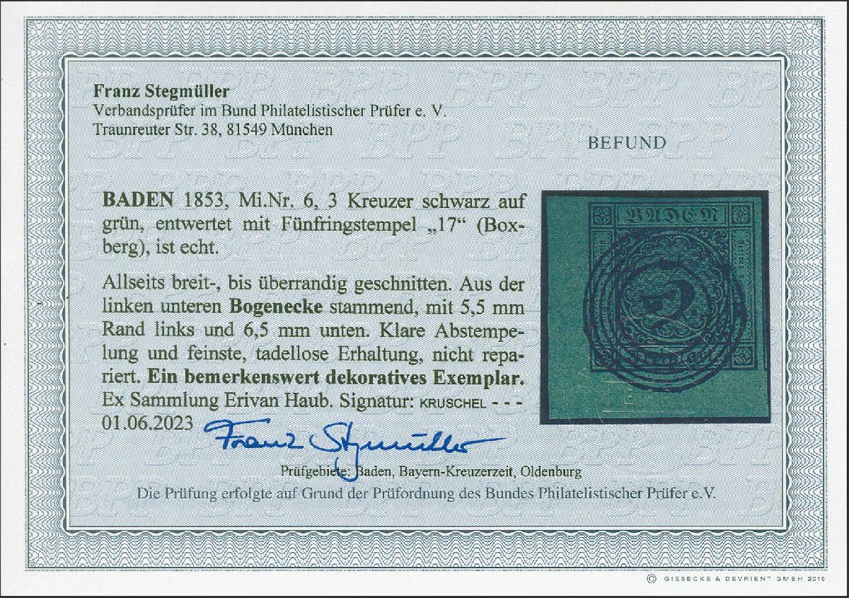 | Zusatzinformationen und Suchstichworte: | 382. Auktion Heinrich Köhler 18. – 23. September 2023 Los 9 3 Kreuzer schwarz auf grün, linke untere Bogenecke, farbfrisch und allseits breit- bis überrandig, mit Teil der rechten Nachbarmarke und ca. 5,5/6,5 mm Bogenrändern, sauber entwertet durch klare Nr. "17" BOXBERG. Tadellos. Signiert Kruschel und Fotobefund Stegmüller BPP (2023) Ausruf 150,00 EUR |