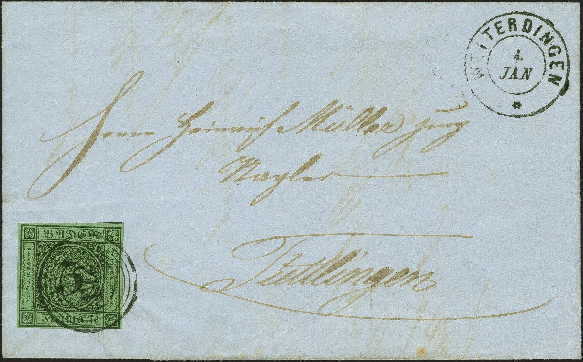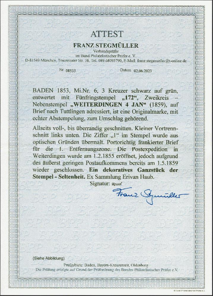 | Zusatzinformationen und Suchstichworte: | 382. Auktion Heinrich Köhler 18. – 23. September 2023 Los 12 1853, 3 Kreuzer auf grün, farbfrisch und allseits breitrandig, mit Nr. "172" und nebengesetztem klaren Doppelkreisstempel "WEITERDINGEN 4 JAN" (1859) auf komplettem Brief nach Tuttlingen. Die Marke hat unten links einen kleinen Vortrennschnitt ins Markenbild reichend, die Ziffer "1" im Stempel wurde aus optischen Gründen übermalt, sonst einwandfrei. Ein sehr seltener Brief; die Postexpedition Weiterdingen wurde am 1.2.1855 eröffnet, jedoch aufgrund des äußerst geringen Postaufkommens bereits am 1.5.1859 wieder geschlossen. Signiert Ressel und Fotoattest Stegmüller BPP (2023) Ausruf 1.000,00 EUR |