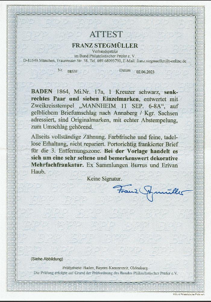 | Zusatzinformationen und Suchstichworte: | 382. Auktion Heinrich Köhler 18. – 23. September 2023 Los 13 1 Kreuzer schwarz, senkrechtes Paar und 7 Einzelmarken, alle farbfrisch und einwandfrei gezähnt, 'pistolenförmig' geklebt, mit mehrfach sauber auf- und nebengesetztem Doppelkreisstempel "MANNHEIM 11 SEP." auf gelblichem Briefkuvert nach Annaberg in Sachsen, mit rückseitigem Bahnpoststempel "ANNABERG-CHEMNITZ" und Ausgabestempel. Eine attraktive und äußerst seltene 'Massenfrankatur' in einwandfreier Erhaltung. Fotoatteste Brettl BPP (1995) und Stegmüller BPP (2023) Ausruf 1.000,00 EUR |