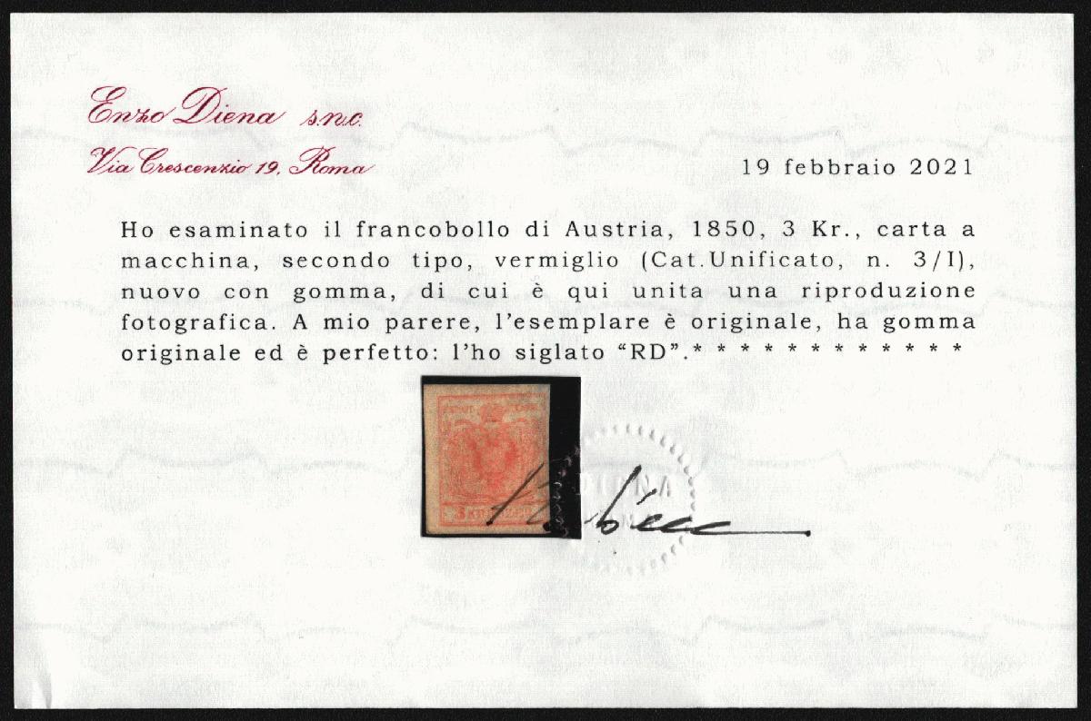 | Zusatzinformationen und Suchstichworte: | Versuch einer Übersetzung: Ich habe die Briefmarke von Österreich, 1850, 3 Kr., Maschinenpapier, zweiter Typ, Zinnoberrot (Unified Cat., Nr. 3 / I), neu mit Gummi, untersucht, von dem hier eine fotografische Reproduktion beigefügt ist. Meiner Meinung nach ist das Exemplar original, hat originalen Gummi und ist perfekt: Ich habe es mit "RD" signiert. |