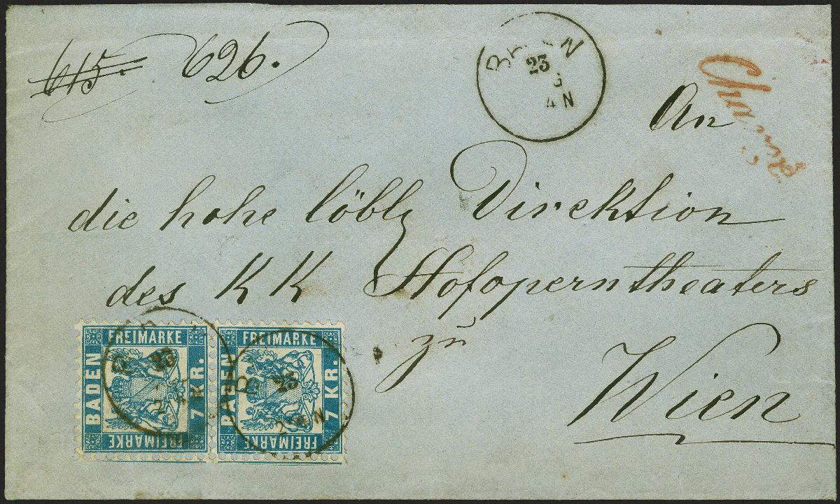 | Zusatzinformationen und Suchstichworte: | 382. Auktion Heinrich Köhler 18. – 23. September 2023 Los 21 7 Kreuzer blau im senkrechten Paar, farbfrisch und einwandfrei gezähnt (links Teile der Nachbarmarken) mit Einkreisstempel "BADEN 23 AUG" (1869) auf gesiegeltem Charge-Brief an die Direktion der Wiener Hofoper. Rückseitig württembergischer Bahnpoststempel und Fingerhutstempel von Wien. Eine attraktive und in dieser Form nicht häufige Mehrfachfrankatur. Fotobefund Stegmüller BPP (2022) Ausruf 200,00 EUR |