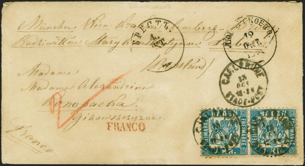 | Zusatzinformationen und Suchstichworte: | 382. Auktion Heinrich Köhler 18. – 23. September 2023 Los 22 7 Kreuzer blau im waagerechten Paar, farbfrisch und allseits gut gezähnt, mit Einkreisstempel "CARLSRUHE STADT-POST 13 OCT" (1871) auf Briefkuvert nach Ginowsneryzne in Rußland, mit ausführlichem Leitvermerk "München Wien Krakau ….Lubar", jedoch über Preußen befördert. Vorder- und rückseitig Transit- und Ankunftsstempeln (julianischer Kalender) sowie roter "FRANCO" des Bahnpostamtes 11. Die Frankatur geringe Patina, sonst tadellos. Ein seltener und interessanter Auslandsbrief. Fotoattest Stegmüller BPP (2023) Ausruf 1.000,00 EUR |
