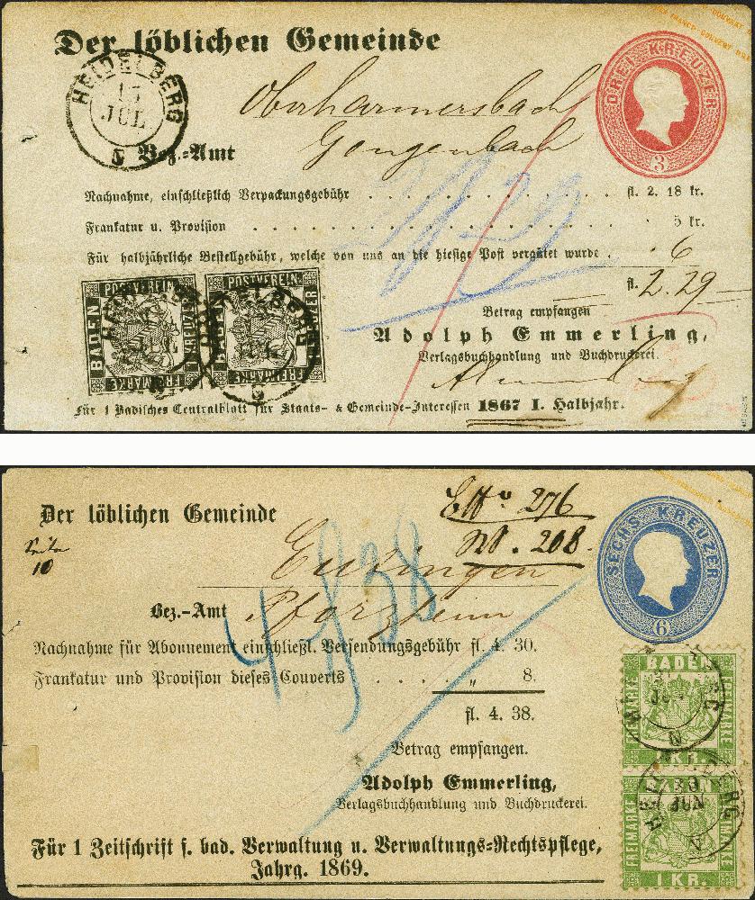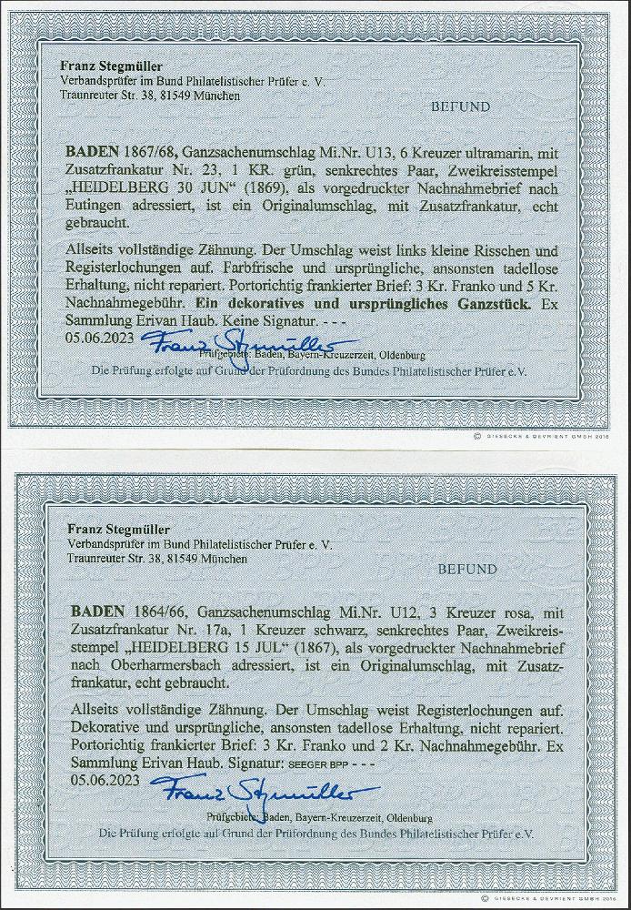| Zusatzinformationen und Suchstichworte: | 382. Auktion Heinrich Köhler 18. – 23. September 2023 Los 24 1866/67, Umschläge 3 Kreuzer rosa und 6 Kreuzer ultramarin, beide mit Zudrucken der Verlagsbuchhandlung Adolph Emmerling, mit Zufrankatur 1862/66, 1 Kreuzer schwarz, bzw. 1868, 1 Kreuzer grün, jeweils im Paar, als Nachname-Briefe nach Gengenbach bzw. Pforzheim. Links jeweil Aufnadelungslöcher und der 6 Kreuzer-Umschlag kleiner Einriss verklebt, sonst einwandfrei. Ein attraktives Briefpaar. Jeweils Fotobefund Stegmüller BPP (2023) Ausruf 500,00 EUR |