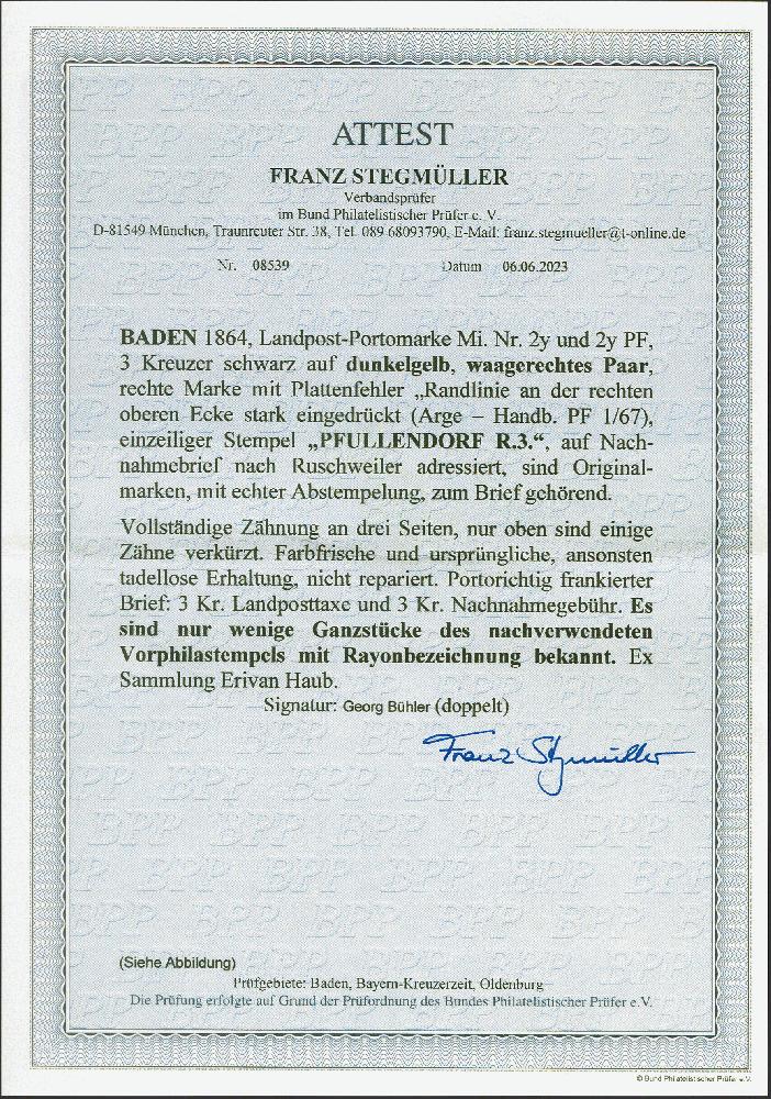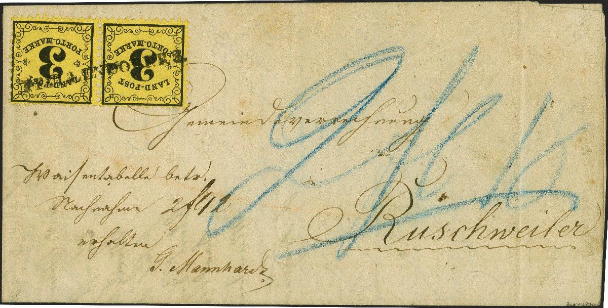 | Zusatzinformationen und Suchstichworte: | 382. Auktion Heinrich Köhler 18. – 23. September 2023 Los 26 3 Kreuzer schwarz auf dunkelgelb im waagerechten Paar, bis auf einige verkürzte Zähne einwandfrei, mit sauber aufgesetztem Langstempel "PFULLENDORF R.3." auf Nachnahmebrief nach Ruschweiler. Ein attraktiver Brief der guten Farbe mit seltener Entwertung. Signiert Georg Bühler und Fotoattest Stegmüller BPP (2023) Ausruf 400,00 EUR |