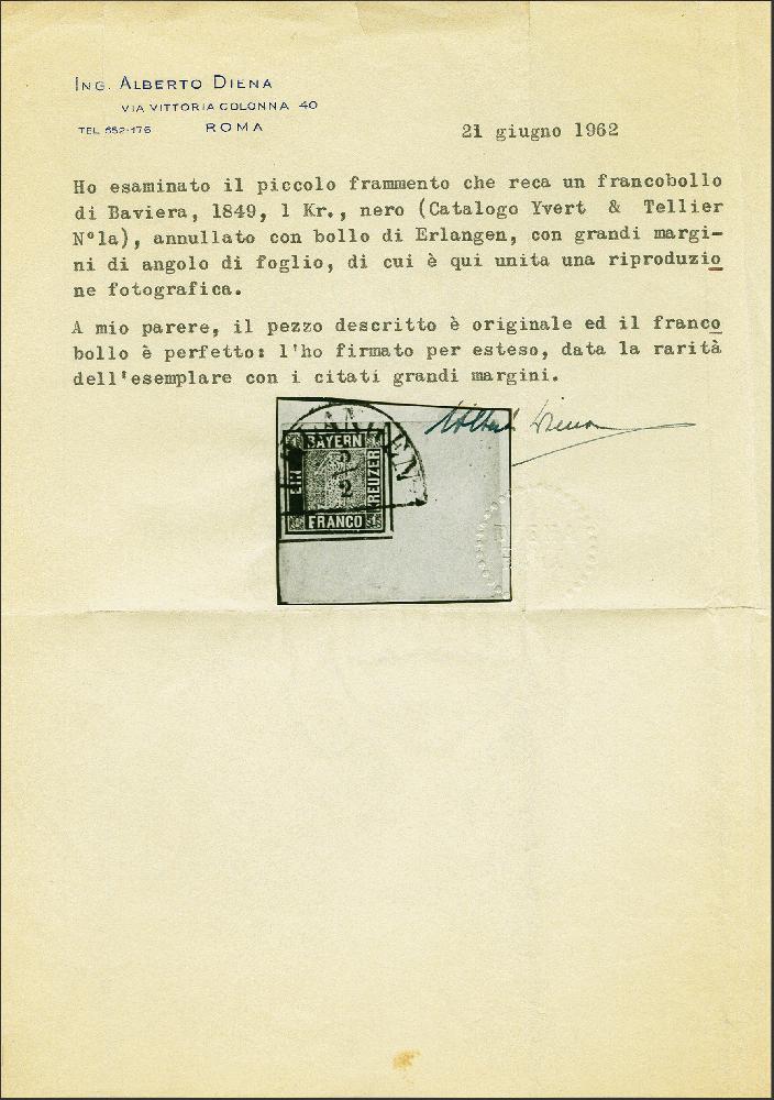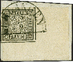 | Zusatzinformationen und Suchstichworte: | 382. Auktion Heinrich Köhler 18. – 23. September 2023 Los 28 1 Kreuzer schwarz, Platte I, rechte untere Bogenecke, farbfrisch und allseits breitrandig, mit ca. 11/21 mm Bogenrändern, mit sehr schön zentrisch und klar aufgesetztem Halbkreisstempel "ERLANGEN 5/2" auf Briefstück. Feinste und tadellose Erhaltung. Das wohl spektakulärste Einzelstück des 'Schwarzen Einsers'. Signiert Kruschel, Alberto Diena mit Fotoattest (1962) Schmitt BPP mit Fotoattest (1975) und Fotoattest Stegmüller BPP (2023) Ausruf 8.000,00 EUR |