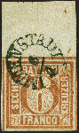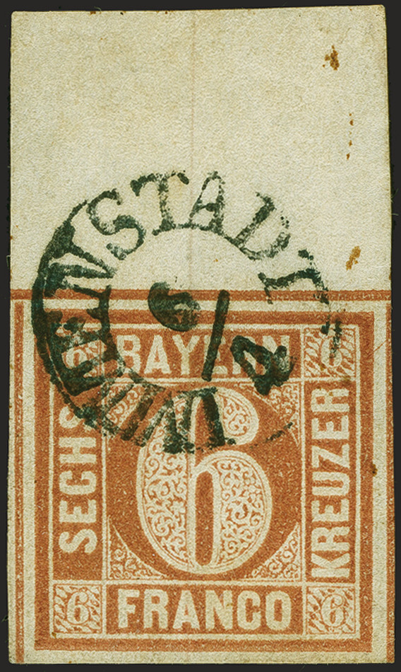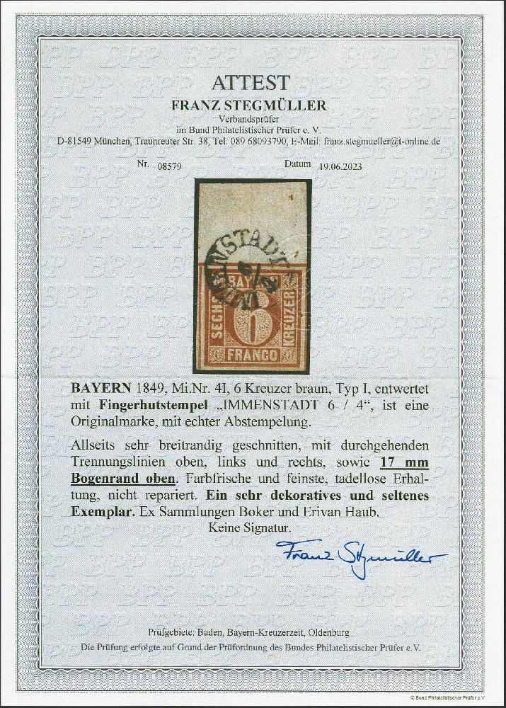 | Zusatzinformationen und Suchstichworte: | 382. Auktion Heinrich Köhler 18. – 23. September 2023 Los 30 6 Kreuzer braunorange, allseits breitrandig, oben mit 17 mm Bogenrand, sehr schön entwertet durch Fingerhutstempel "IMMENSTADT 6/4". Ein wundervolles Stück in tadelloser Erhaltung. Fotoattest Stegmüller BPP (2023) Provenienz: John Boker jr. (1987) Ausruf 500,00 EUR |