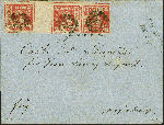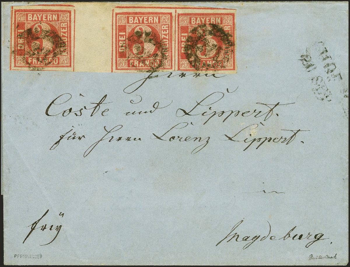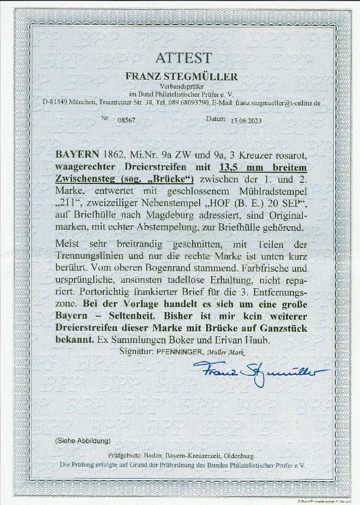 | Zusatzinformationen und Suchstichworte: | 382. Auktion Heinrich Köhler 18. – 23. September 2023 Los 35 3 Kreuzer rosarot im waagerechten Zwischensteg-Dreierstreifen, farbfrisch und bis auf eine unwesentliche kleine Berührung bei der rechten, für das Zwischenstegpaar unerhebliche, Marke, allseits voll-bis überrandig, vom oberen Bogenrand stammend, mit gMR "211" auf Briefhülle von "HOF(B.E.) 20 SEP" nach Magdeburg. Farbfrische und ursprüngliche, ansonsten tadellose Erhaltung. Gebrauchte "Bayern-Brücken" der Kreuzer-Zeit sind allergrößte Seltenheiten; auf Brief haben wir nur 12 Stück registriert, dabei nur eine weitere der 3 Kreuzer rosa (als Paar). Ein bedeutendes Unikat der Bayern-Philatelie. Signiert Müller-Mark mit Attest (1949), Pfenninger mit Attest (1952) und Fotoattest Stegmüller BPP (2023) Ausruf 20.000,00 EUR |