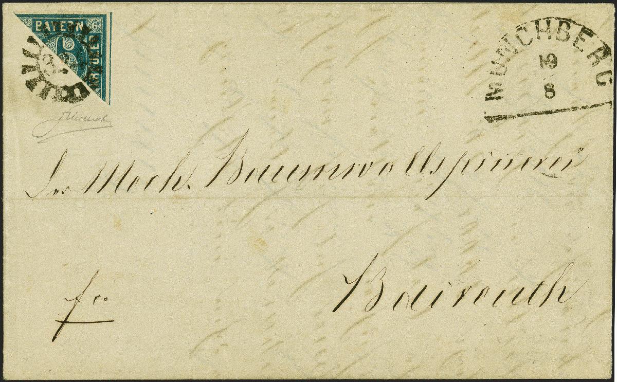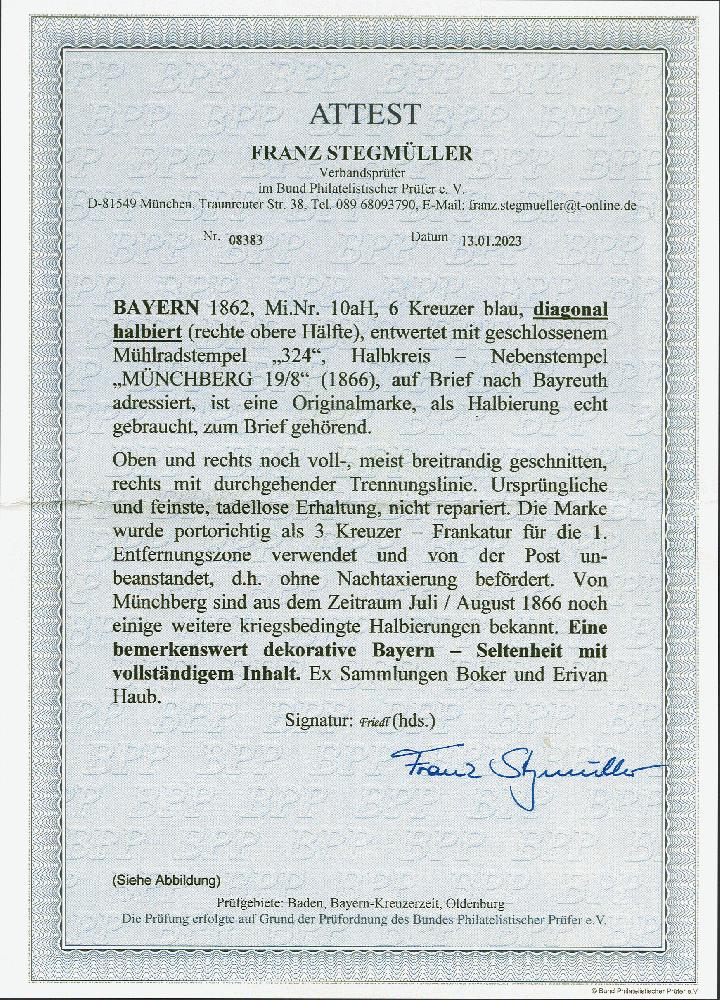 | Zusatzinformationen und Suchstichworte: | 382. Auktion Heinrich Köhler 18. – 23. September 2023 Los 37 6 Kreuzer blau, diagonal halbiert, rechte obere Hälfte, schöne Tiefe Farbe, kurz noch voll-, sonst breitrandig, mit gerade aufgesetztem gMR "324" auf komplettem Faltbrief mit nebengesetztem Halbkreisstempel "MÜNCHBERG 19/8" (1866) nach Bayreuth mit Ankunftsstempel. Ursprüngliche und tadellose Erhaltung. Einer der schönsten Briefe mit dieser Halbierung. Signiert Friedl und Fotoattest Stegmüller BPP (2023) Ausruf 8.000,00 EUR |