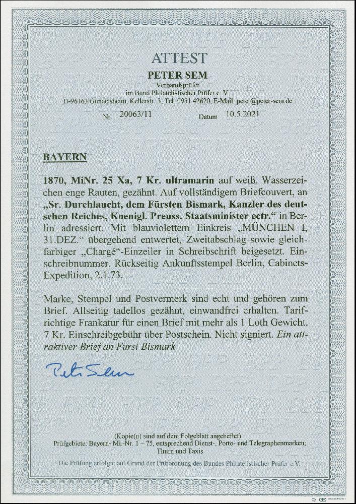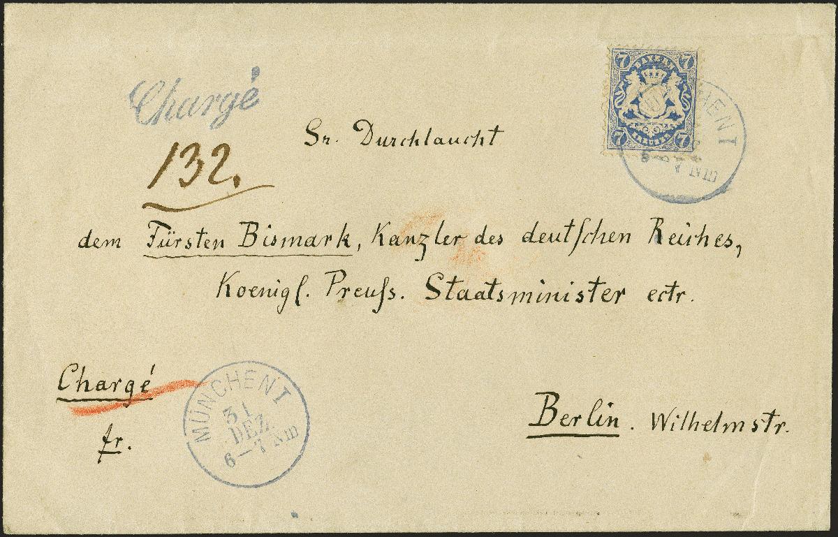 | Zusatzinformationen und Suchstichworte: | 382. Auktion Heinrich Köhler 18. – 23. September 2023 Los 41 7 Kreuzer ultramarin, farbfrisch und tadellos gezähnt, mit sauber auf- und nebengesetztem blauviolettem Einkreisstempel "MÜNCHEN I 31 DEZ."(1873) auf Chargé-Briefkuvert an den Kanzler des Deutschen Reiches, Fürst von Bismarck, in Berlin, mit Ankunftsstempel des Cabinetspostamtes. Ein sehr attraktiver und interessanter Brief in tadelloser Erhaltung. Fotoattest Sem BPP (2022) Ausruf 200,00 EUR |
