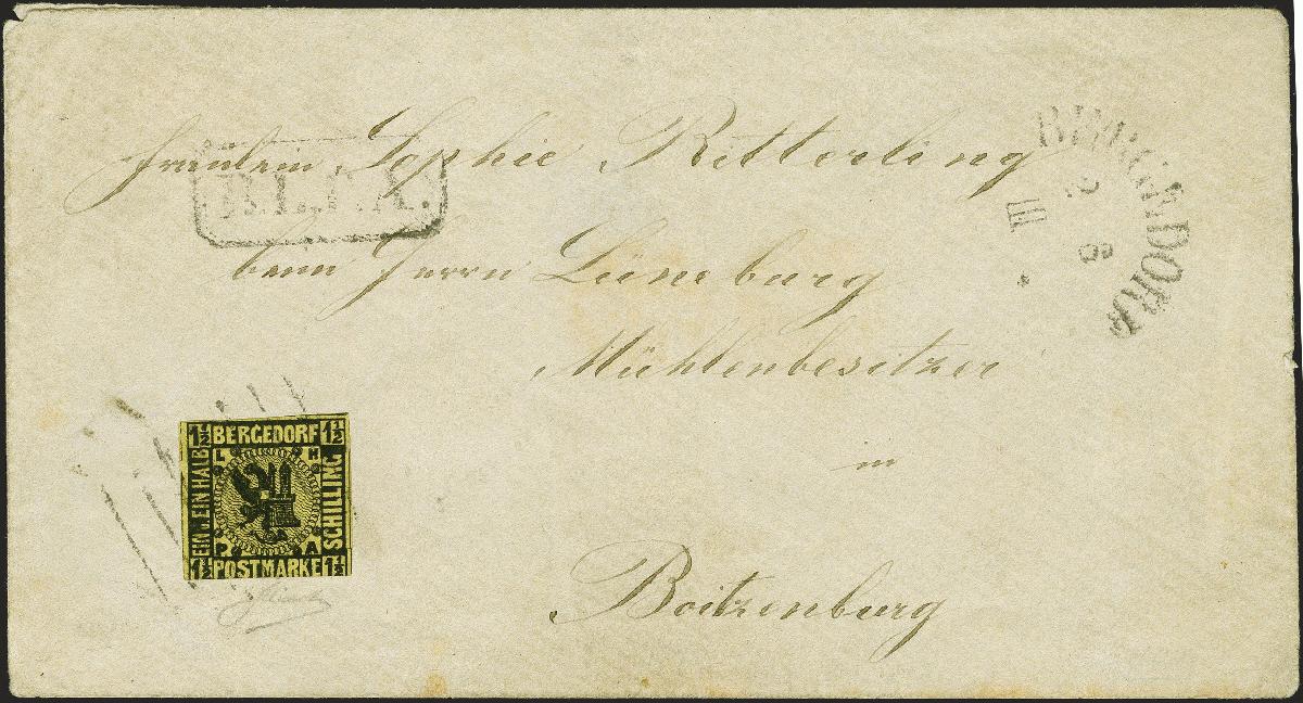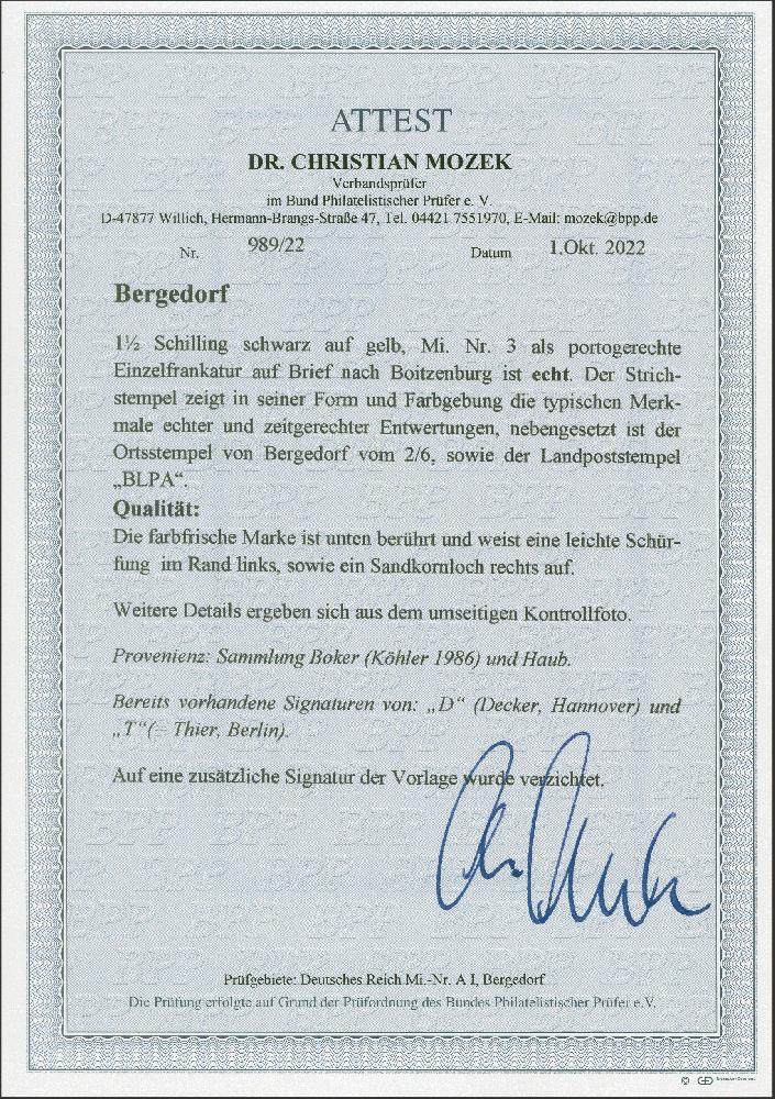 | Zusatzinformationen und Suchstichworte: | 382. Auktion Heinrich Köhler 18. – 23. September 2023 Los 46 1½ Schilling schwarz auf gelb, farbfrisch, unten berührt, sonst voll- bis breitrandig, meist mit Zwischenlinien, mit sauber aufgesetztem Strichstempel auf Briefkuvert mit nebengesetztem Aufgabestempel "BERGEDORF 2 6" und Rahmenstempel "B.L.P A." nach Boitzenburg. Die Marke im linken Rand minimale Schürfung und rechts unauffälliges Sandkornloch, sonst einwandfreie und schöne Erhaltung. Ein seltener Brief. Signiert Decker und Thier, Fotoattest Dr. Mozek BPP (2022) Ausruf 2.000,00 EUR |