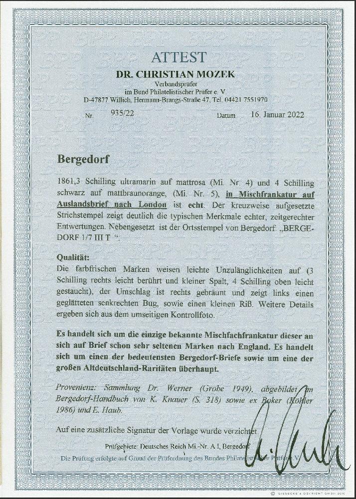 | Zusatzinformationen und Suchstichworte: | 382. Auktion Heinrich Köhler 18. – 23. September 2023 Los 47 3 Schilling blau auf rosa und 4 Schilling schwarz auf rotbraun, beide farbfrisch, die 3 Schilling rechts leicht berührt und kleiner Spalt, die 4 Schilling voll- bis meist breitrandig, vom unteren Bogenrand stammend, mit sauber kreuzförmig aufgesetztem Strichstempel, als 7-Schilling-Frankatur auf Briefkuvert mit nebengesetztem Aufgabestempel "BERGEDORF 1/7 III T"(1866) und rückseitigem Durchgangsstempel des Hamburger Stadtpostamtes vom selben Tag, nach London. Nebengesetzt roter Ovalstempel "P.D." und "LONDON PAID 3 JY 66". Die 4 Schilling oben durch Randklebung leicht gestaucht, das Kuvert rechts gering fleckig und außerhalb der Frankatur senkrecht gefaltet, sonst einwandfrei. Dies ist die einzig bekannte Farbfrankatur dieser beiden äußerst seltenen Marken und eine der großen Brief-Seltenheiten der Altdeutschen Staaten. Signiert Friedl mit Fotoattest (1949), Fotoattest Dr. Mozek BPP (2022) Ausruf 40.000,00 EUR |