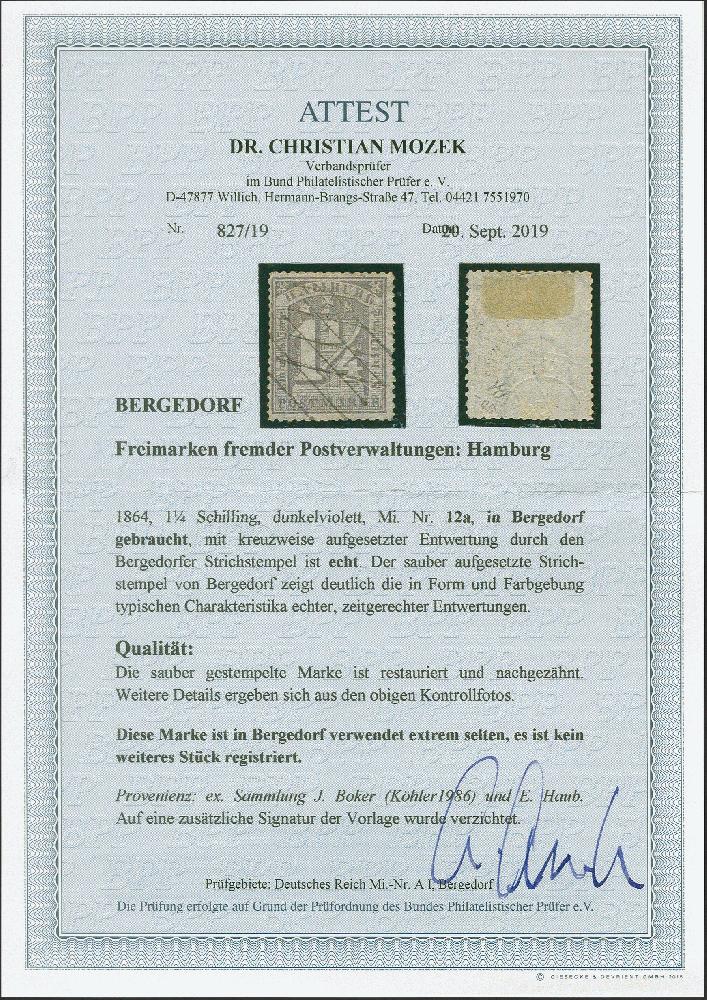 | Zusatzinformationen und Suchstichworte: | 382. Auktion Heinrich Köhler 18. – 23. September 2023 Los 55 1864, gezähnte Ausgabe 1¼ Schilling dunkelviolett mit kreuzweise aufgesetztem Strichstempel; restauriert und nachgezähnt. Einzig registriertes Exemplar dieser Marke in Bergedorf verwendet. Fotoattest Dr. Mozek BPP (2019) Ausruf 500,00 EUR |
