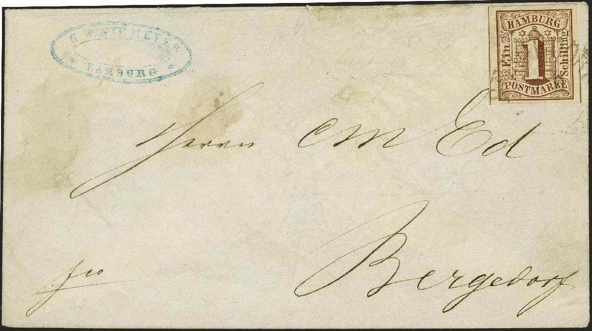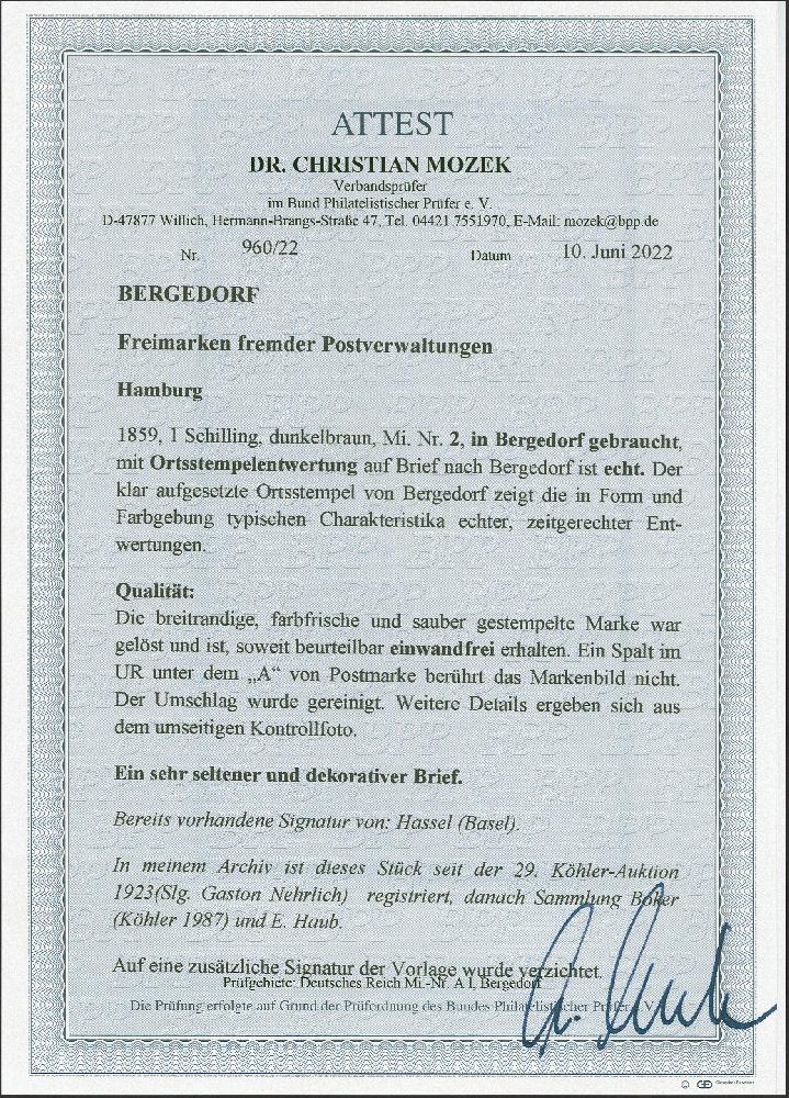 | Zusatzinformationen und Suchstichworte: | 382. Auktion Heinrich Köhler 18. – 23. September 2023 Los 57 1859, 1 Schilling braun, farbfrisch und allseits breitrandig, mit zart aufgesetztem Ortsstempel auf Briefkuvert mit Absenderstempel aus Hamburg, nach Bergedorf mit rückseitigem klarem Ankunftsstempel "BERGEDORF 7 6". Die Marke war gelöst und das Kuvert etwas gereinigt; ein kleiner Randspalt berührt das Markenbild nicht, sonstige Mängel sind nicht feststellbar. Ein sehr seltener Brief. Signiert Hassel, Basel, Fotoattest Dr. Mozek BPP (2022) Ausruf 1.000,00 EUR |
