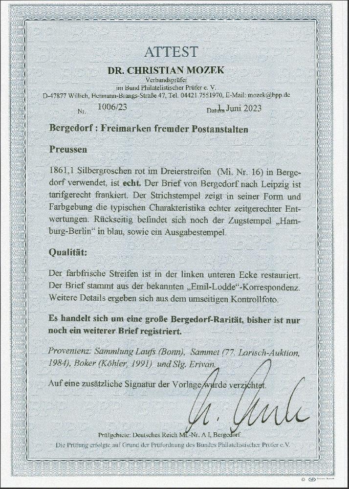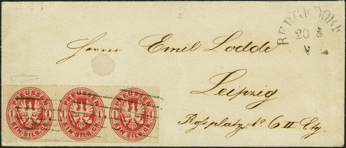 | Zusatzinformationen und Suchstichworte: | 382. Auktion Heinrich Köhler 18. – 23. September 2023 Los 59 Preußen 1861, 1 Silbergroschen rot, waagerechter Dreierstreifen, mit klarem, übergehendem Fünfstrichstempel und nebengesetztem Ortsstempel "BERGEDORF 20.8. V" auf kleinem Briefkuvert nach Leipzig, mit rückseitigem Bahnpoststempel "HAMBURG/BERLIN" und Ausgabestempel vom nächsten Tag. Die linke untere Ecke des Streifens ist repariert, sonst einwandfreie und sehr frische Erhaltung. ein außerordentlich seltener und attraktiver Brief; es ist nur ein weiterer mit der preußischen Wappenausgabe aus Bergedorf registriert. Fotoattest Dr. Mozek BPP (2023) Ausruf 5.000,00 EUR |