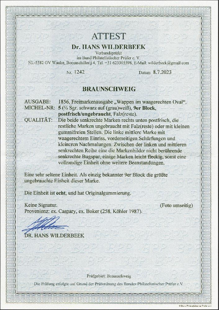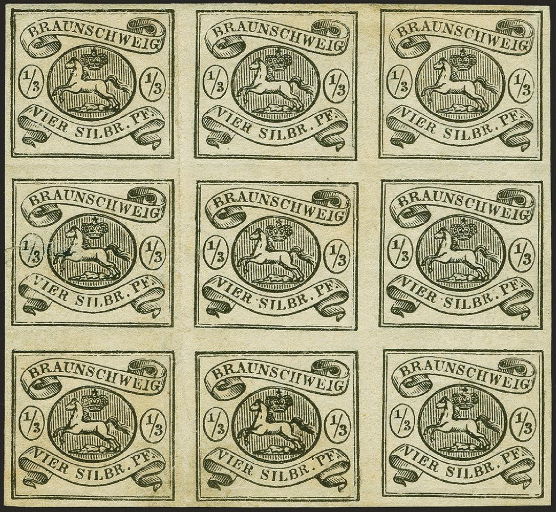 | Zusatzinformationen und Suchstichworte: | 382. Auktion Heinrich Köhler 18. – 23. September 2023 Los 67 ⅓ Silbergroschen schwarz im 9er-Block, farbfrisch und allseits breitrandig, ungebraucht mit originalem Gummi, 2 Werte postfrisch. Die Einheit ist im linken Zwischenraum senkrecht vorgefaltet, der mittlere linke Wert etwas fehlerhaft, sonst einwandfrei. Größte registrierte Einheit dieser Marke und der ersten beiden Ausgaben von Braunschweig überhaupt. Ein phänomenales Stück. Fotoattest Dr. Wilderbeek BPP (2023) Ausruf 5.000,00 EUR |