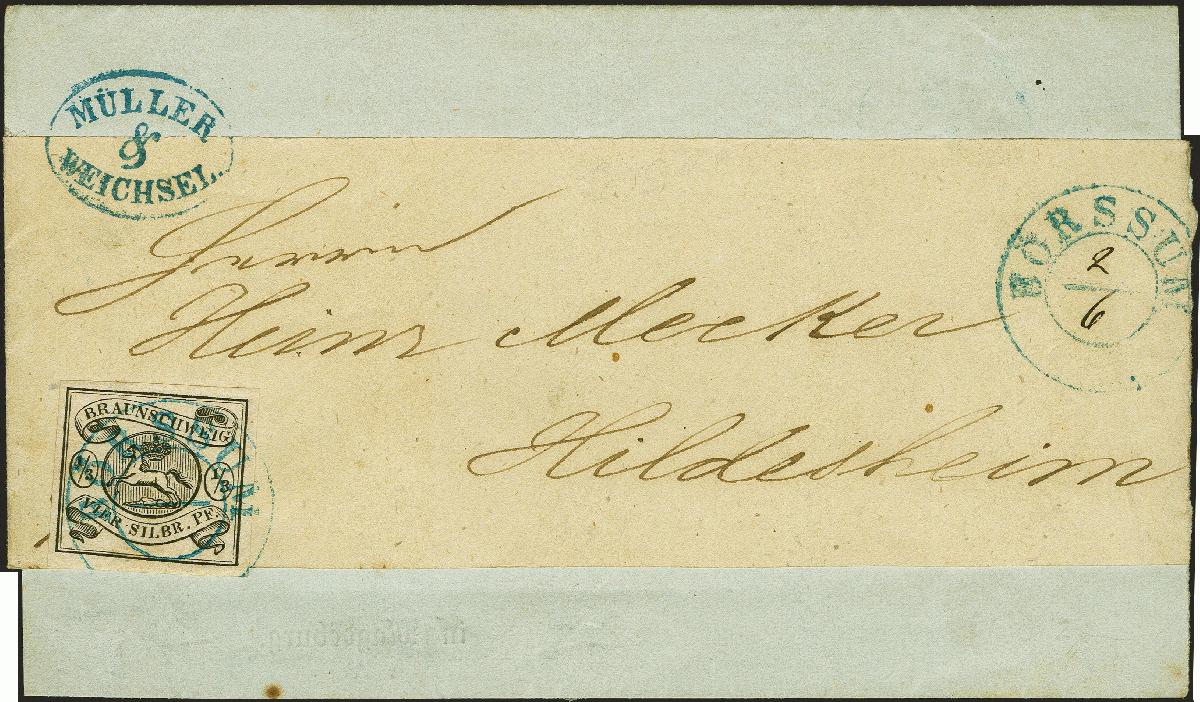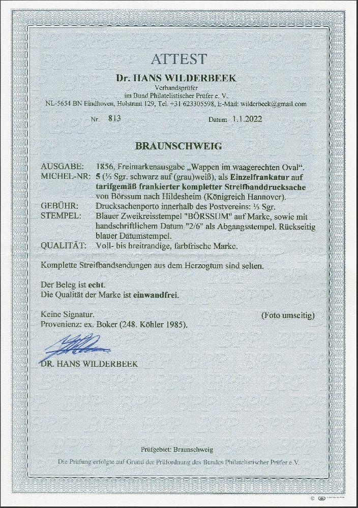 | Zusatzinformationen und Suchstichworte: | 382. Auktion Heinrich Köhler 18. – 23. September 2023 Los 68 ⅓ Silbergroschen schwarz, farbfrisch und gut voll- bis breitrandig, mit sauber auf- und nebengesetztem blauen Vorphila-Doppelkreisstempel "BÖRSSUM" (der nebengesetztem mit handschriftlichem Datum 2/6) auf vollständiger Streifbandsendung mit Absenderstempel der Schokoladenmanufaktur Müller & Weichsel aus Magdeburg, nach Hildesheim mit rückseitigem Ausgabestempel. Eine besonders attraktive und außerhalb Braunschweigs außerordentlich seltene Einzelfrankatur in tadelloser Erhaltung. Fotoattest Dr. Wilderbeek BPP (2022) Ausruf 2.000,00 EUR |