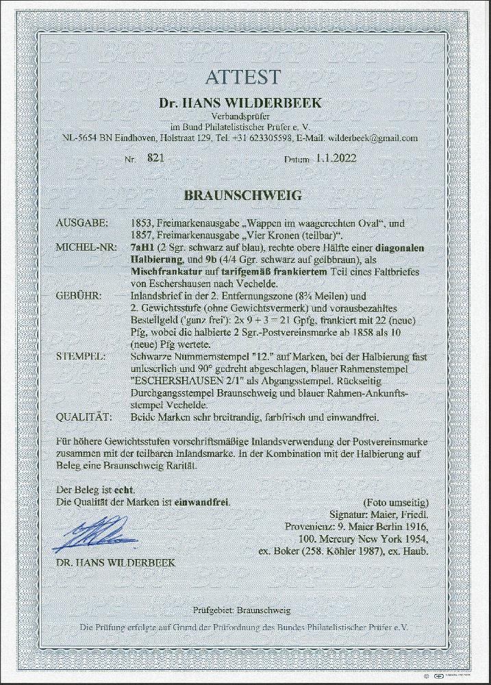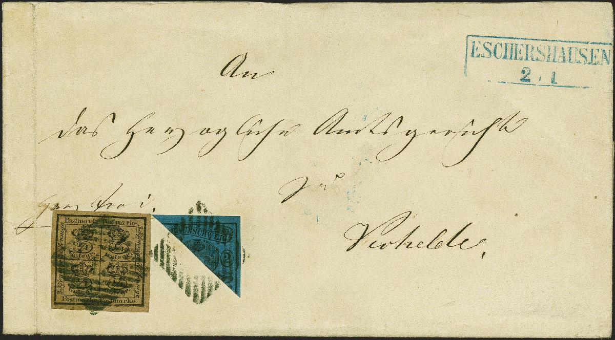 | Zusatzinformationen und Suchstichworte: | 382. Auktion Heinrich Köhler 18. – 23. September 2023 Los 69 2 Silbergroschen schwarz auf blau, diagonal halbiert, rechte obere Hälfte, in portogerechter Mischfrankatur mit teilbarer Inlandsmarke 4/4 Silbergroschen auf gelbbraun, beide Marken farbfrisch und allseits breitrandig, mit jeweils sauber aufgesetzter Nr. "12" und klar nebengesetztem blauen Rahmenstempel "ESCHERSHAUSEN 2/1" auf Briefhülle der 2.Gewichtsstufe (obere Rückklappe fehlend) mit vorausbezahltem Bestellgeld nach Vechelde. Rückseitig Durchgangsstempel von Braunschweig und Ankunftsstempel. Das Porto betrug 18 Gutepfennig plus 3 Gutepfennig Bestellgeld, bezahlt durch die 4/4 Gutegroschen Inlandsmarke (= 12 Gutepfennig) plus der halbierten 2 Silbergroschen (= 10 neue Pfennig). Eine in dieser Kombination einmalige Frankatur und eine der großen Seltenheiten der Braunschweig-Philatelie. Signiert Friedl, Wien, Fotoattest Dr. Wilderbeek BPP (2022) Ausruf 20.000,00 EUR |