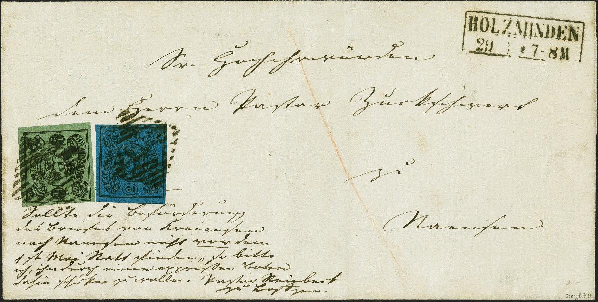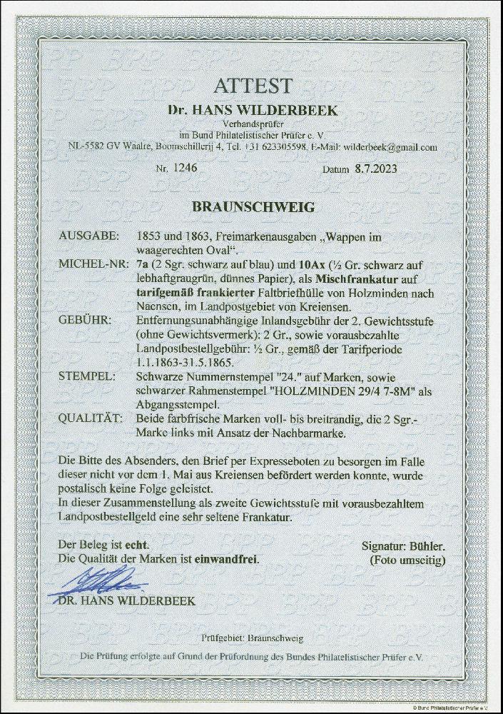 | Zusatzinformationen und Suchstichworte: | 382. Auktion Heinrich Köhler 18. – 23. September 2023 Los 71 ½ Silbergroschen schwarz auf grün, in Mischfrankatur mit 1853, 2 Silbergroschen schwarz auf blau, beide farbfrisch und voll- bis breitrandig, die 2 Silbergroschen mit Teil einer Nachbarmarke, mit Nr. "24" und sauber nebengesetztem Rahmenstempel "HOLZMINDEN 29 4" auf Briefhülle der 2.Gewichtsstufe mit vorausbezahltem Landpost-Bestellgeld nach Naensen im Landpostgebiet von Kreiensen. Die vorderseitig angebrachte Bitte um sofortige Express-Bestellung wurde postalischerseits offenbar nicht beachtet. Eine sehr seltene Frankaturkombination in einwandfreier Erhaltung. Signiert Georg Bühler, Fotoattest Dr. Wilderbeek BPP (2023) Ausruf 1.000,00 EUR |