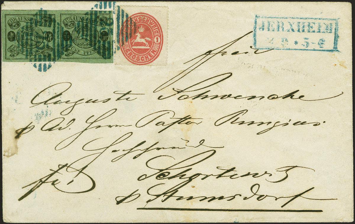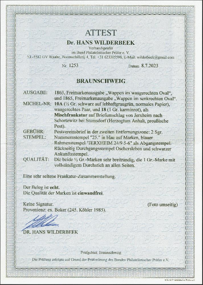 | Zusatzinformationen und Suchstichworte: | 382. Auktion Heinrich Köhler 18. – 23. September 2023 Los 72 ½ Silbergroschen schwarz auf grün, waagerechtes Paar, farbfrisch und allseits breitrandig, in Mischfrankatur mit 1863, 1 Silbergroschen karminrot, farbfrisch und einwandfrei durchstochen, mit zweimal sauber aufgesetzter blauer Nr. "25" und nebengesetztem Rahmenstempel "JERXSHEIM 24/9" auf Briefhülle nach Schortewitz in Anhalt, mit rückseitigem Durchgangsstempel von Oschersleben. Das Kuvert geringe Beförderungsspuren, sonst tadellos. Eine - insbesondere auf normalem Postvereins-Brief – außerordentlich seltene Frankaturkombination. Fotoattest Dr. Wilderbeek BPP (2023) Ausruf 1.000,00 EUR |
