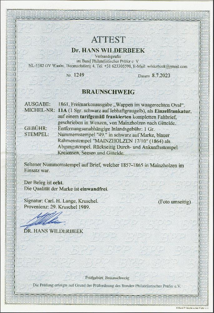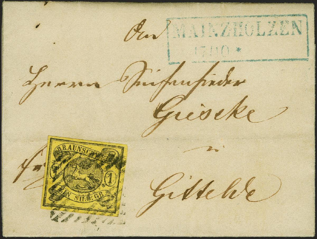 | Zusatzinformationen und Suchstichworte: | 382. Auktion Heinrich Köhler 18. – 23. September 2023 Los 73 1 Silbergroschen schwarz auf gelb, farbfrisch und allseits breitrandig, mit leicht aufgesetzter schwarzer Nr. "49" und sauber nebengesetztem blauem Rahmenstempel "MAINZHOLZEN 17/10" (1864) auf komplettem kleinen Faltbrief nach Gittelde mit Durchgangsstempel von Kreiensen. Schöne und einwandfreie Erhaltung. Der Nummernstempel des kleinen Ortes Mainzholzen ist auf Brief eine große Seltenheit; mit der geschnittenen Wappenausgabe haben wir keinen weiteren Brief registriert. Signiert Kruschel und Fotoattest Dr. Wilderbeek BPP Ausruf 800,00 EUR |