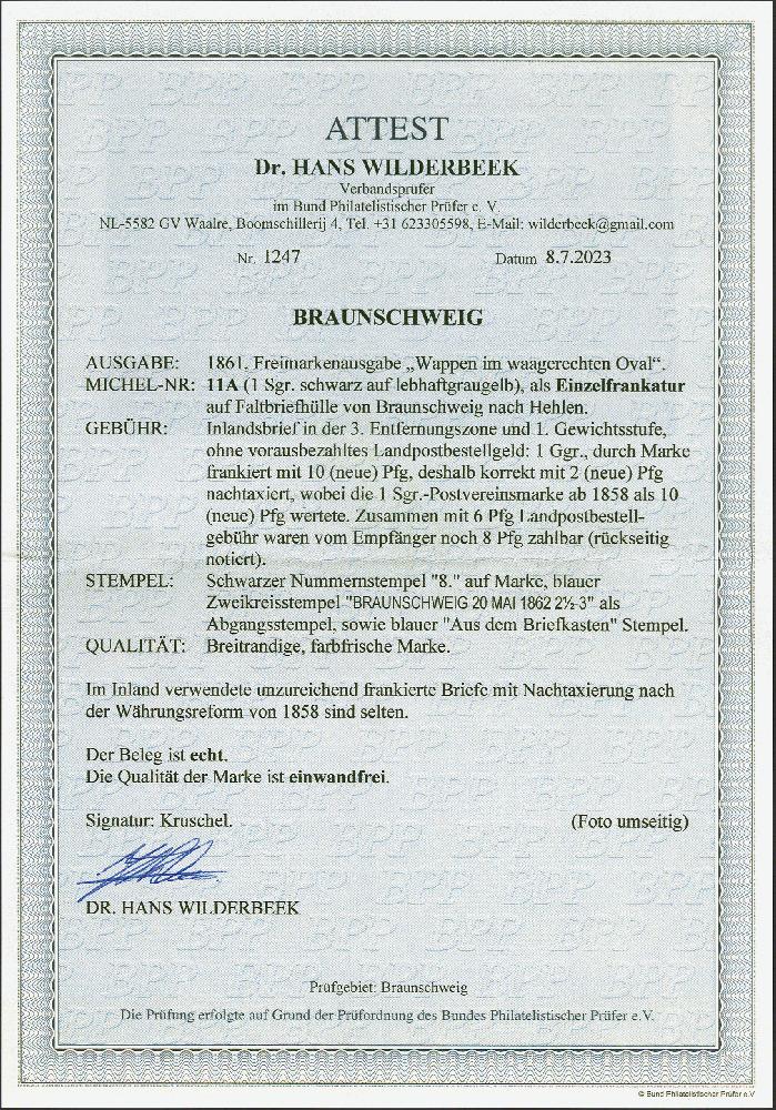 | Zusatzinformationen und Suchstichworte: | 382. Auktion Heinrich Köhler 18. – 23. September 2023 Los 74 1 Silbergroschen schwarz auf gelb, farbfrisch und allseits breitrandig, mit schwarzer Nr. "8" und sauber nebengesetztem blauen Doppelkreisstempel "BRAUNSCHWEIG 20 Mai 1862" und Rahmenstempel "Aus dem Briefkasten" auf Briefhülle nach Hehlen. Da die Inlandsgebühr bis Ende 1862 1 Gutegroschen (gleich 12 Gutepfennige) betrug, die verklebte 1 Silbergroschen-Marke jedoch nur 10 Gutepfennige wertete, wurde der Brief ordnungsgemäß mit "2" Pfennigen nachtaxiert, vom Empfänger einschließlich des Landpostbestellgeldes "8" Pfennige eingezogen (rückseitig notiert). Ein postgeschichtlich sehr interessanter Brief. Signiert Kruschel, Fotoattest Dr. Wilderbeek BPP (2023) Ausruf 300,00 EUR |