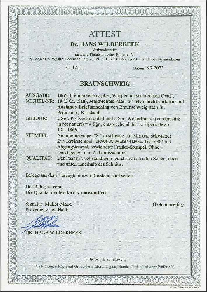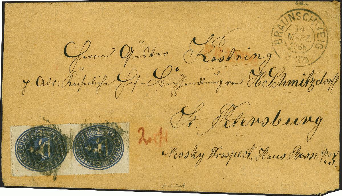 | Zusatzinformationen und Suchstichworte: | 382. Auktion Heinrich Köhler 18. – 23. September 2023 Los 77 1865, 2 Groschen blau im senkrechten Paar, farbfrisch und einwandfrei durchstochen (oben und unten Scherenschnitt außerhalb), mit Nr. "8" und sauber nebengesetztem Doppelkreisstempel "BRAUNSCHWEIG 14 März 1866" sowie rotem Langstempel "FRANCO", auf Briefkuvert nach St. Petersburg. Ein sehr seltener Auslandsbrief. Signiert Müller-Mark und Fotoattest Dr. Wilderbeek BPP (2023) Ausruf 1.000,00 EUR |