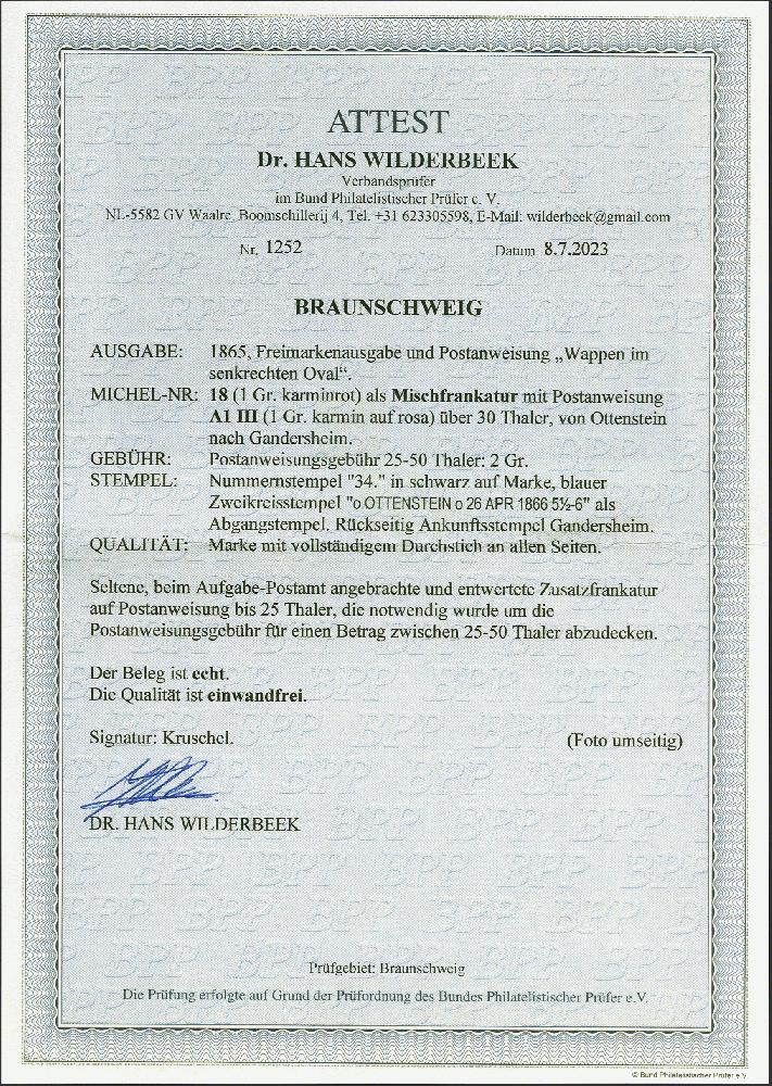| Zusatzinformationen und Suchstichworte: | 382. Auktion Heinrich Köhler 18. – 23. September 2023 Los 78 1 Groschen karminrot, farbfrisch und gut durchstochen (oben Scherentrennung außerhalb), mit Nr. "34" als Zufrankatur auf Postanweisung 1 Groschen, mit sauber nebengesetztem blauem Doppelkreisstempel "OTTENSTEIN 26 APR 1866", für einen Betrag von 30 Talern nach Gandersheim mit rückseitiger Empfangsbestätigung und Ankunftsstempel. Die Marke zeigt unten links einen kleinen Anlagepunkt In Markenfarbe. Ein ungewöhnliches Stück mit seltener Entwertung; wir haben kein weiteres Ganzstück mit dem Nummernstempel von Ottenstein auf der letzten Ausgabe registriert. Signiert Kruschel und Fotoattest Dr. Wilderbeek BPP (2023) Ausruf 500,00 EUR |