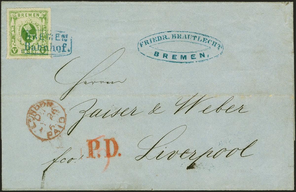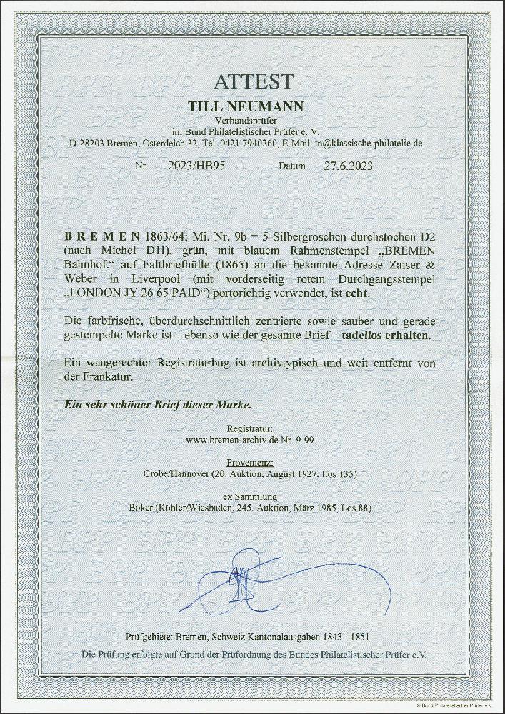 | Zusatzinformationen und Suchstichworte: | 382. Auktion Heinrich Köhler 18. – 23. September 2023 Los 82 5 Silbergroschen grün, einwandfrei durchstochen und, farbfrisch, mit sauber aufgesetztem blauem Rahmenstempel "BREMEN Bahnhof." auf Briefhülle aus der bekannten Zaiser & Weber-Korrespondenz nach Liverpool. Ein äußerst dekorativer Brief in tadelloser Erhaltung. Fotoattest Neumann BPP (2023) Ausruf 1.000,00 EUR |