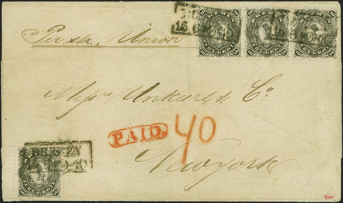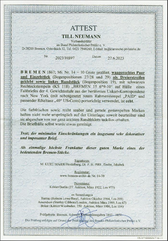 | Zusatzinformationen und Suchstichworte: | 382. Auktion Heinrich Köhler 18. – 23. September 2023 Los 83 1866/67, 10 Grote schwarz, waagerechtes Paar und 2 Einzelwerte, davon einer mit linken Bogenrand, farbfrisch und bis auf minimale Randfehler gut gezähnt, mit klarem Rahmenstempel "BREMEN 15 6" auf Briefhülle der 4. Gewichtsstufe nach New York. Die Briefhülle ist etwas gereinigt, die Marken zu diesem Zwecke gelöst, sonst in tadelloser Erhaltung. Größte und einmalige Mehrfachfrankatur dieser Marke und - zusammen mit dem Pendant-Brief der durchstochenen Ausgabe – die höchste bekannte Frankatur von Bremen überhaupt. Signiert Kurt Maier, Dr. Pirl, Drahn und Jakubek, Fotoattest Neumann BPP (2023) Ausruf 25.000,00 EUR |