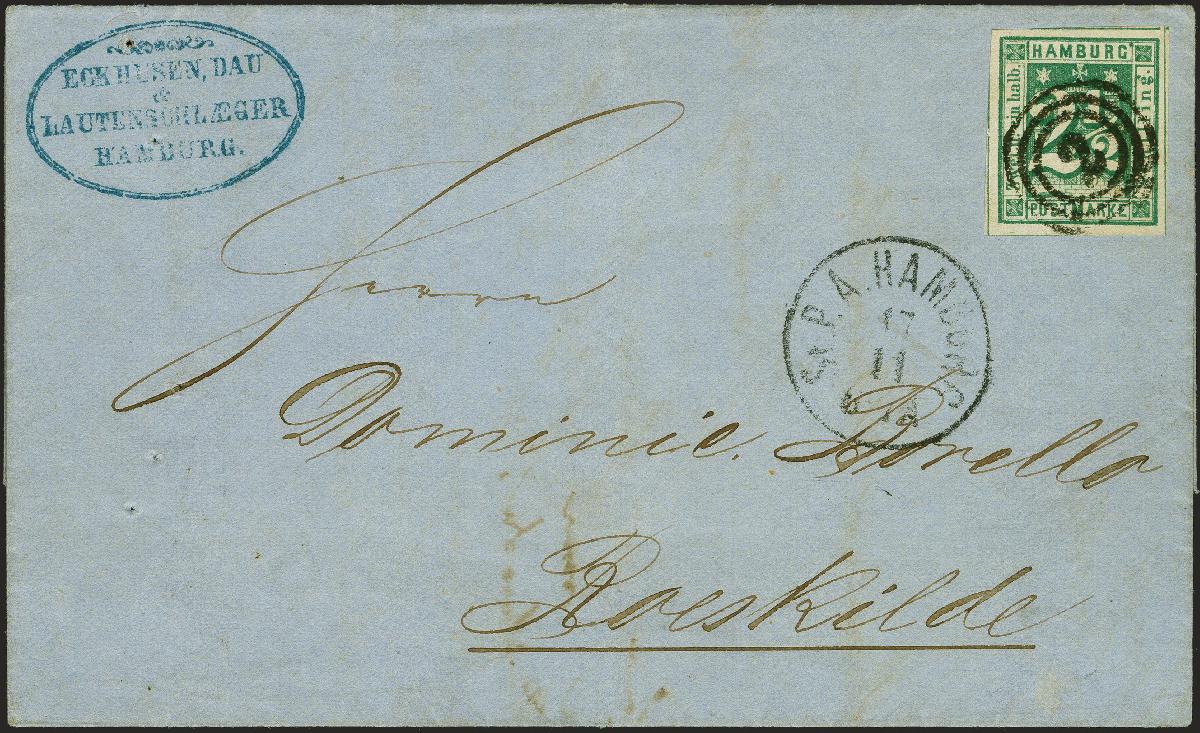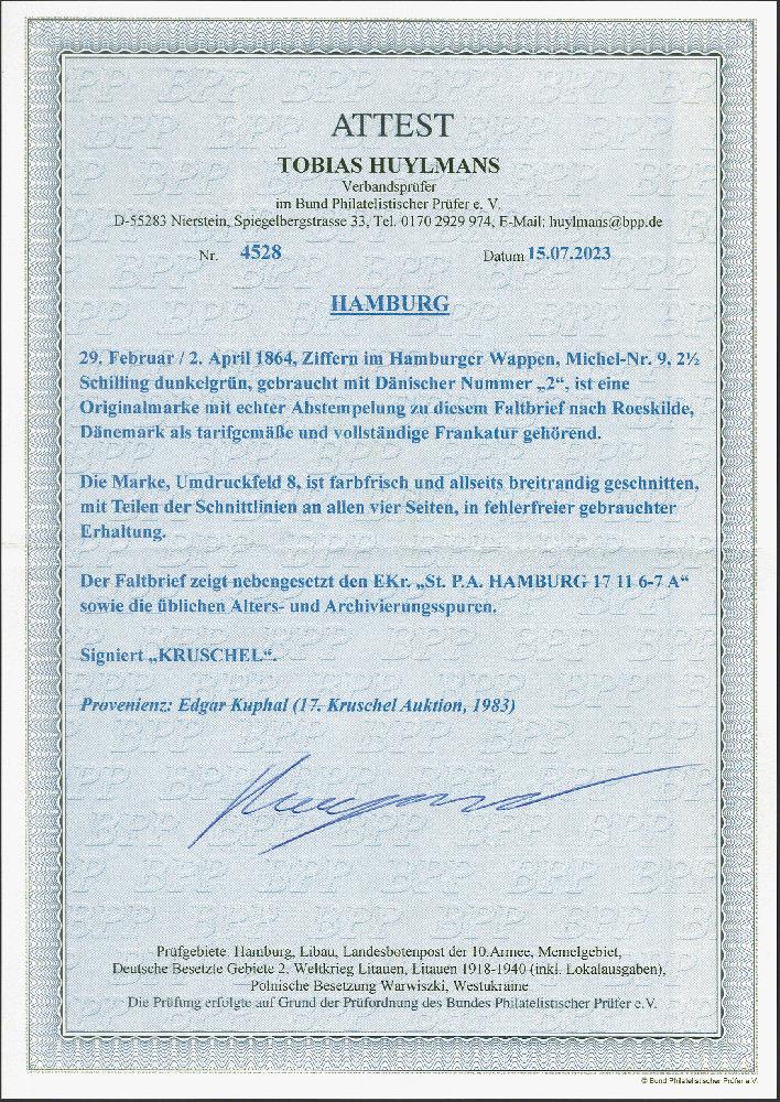 | Zusatzinformationen und Suchstichworte: | 382. Auktion Heinrich Köhler 18. – 23. September 2023 Los 87 2½ Schilling grün, farbfrisch und allseits breitrandig mit Teilen aller Schnittlinien, mit sauber aufgesetzter Nr. 2 auf Briefhülle mit nebengesetztem Einkreisstempel "St.P.A. HAMBURG 17 11" und dekorativem Absenderstempel nach Roskilde in Dänemark. Signiert Kruschel und Fotoattest Huylmans BPP (2023) Ausruf 200,00 EUR |
