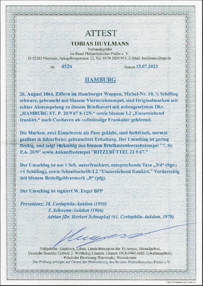 | Zusatzinformationen und Suchstichworte: | 382. Auktion Heinrich Köhler 18. – 23. September 2023 Los 89 ½ Schilling schwarz, 2 Einzelwerte, farbfrisch und einwandfrei gezähnt, mit blauem Balkenstempel und sauber nebengesetztem blauem Doppelkreisstempel "HAMBURG ST. P. 20/9 67" sowie ebenfalls blauem "Unzureichend frankiert" auf Briefkuvert nach Cuxhaven, mit Ankunftsstempel von Ritzebüttel. Minimale Patina, sonst einwandfrei. Signiert Engel BPP, Fotoattest Huylmans BPP (2023) Ausruf 200,00 EUR |