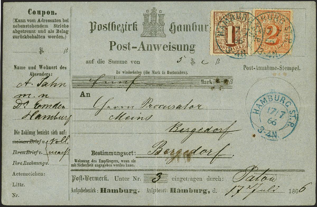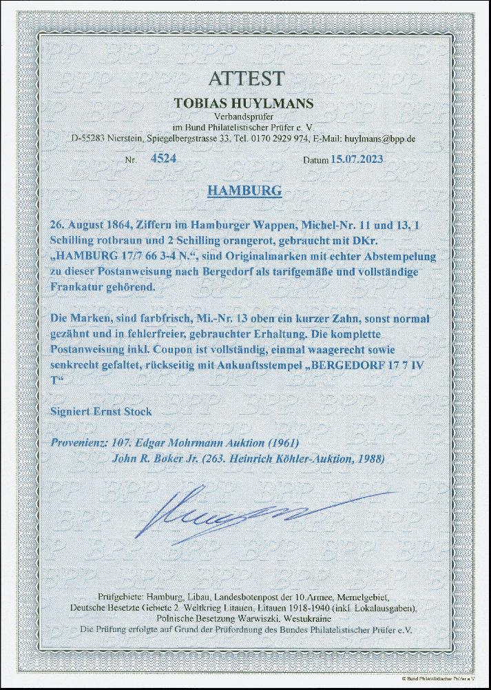 | Zusatzinformationen und Suchstichworte: | 382. Auktion Heinrich Köhler 18. – 23. September 2023 Los 91 1 Schilling braun zusammen mit 2 Schilling rot, beide farbfrisch und bis auf einen kurzen Zahn bei der 2 Schilling gut gezähnt, mit sauber aufgesetztem blauen Doppelkreisstempel "HAMBURG ST.P. 17/7.66" auf Postanweisungsformular nach Bergedorf mit rückseitigem Ankunftsstempel "BERGEDORF 177 IV T" und Auszahlungsvermerk. Ein attraktives Stück in sonst einwandfreier Erhaltung (übliche Faltungen). Signiert Stock, Fotoattest Huylmans BPP (2023) Ausruf 1.000,00 EUR |
